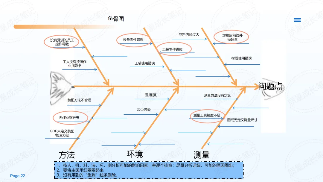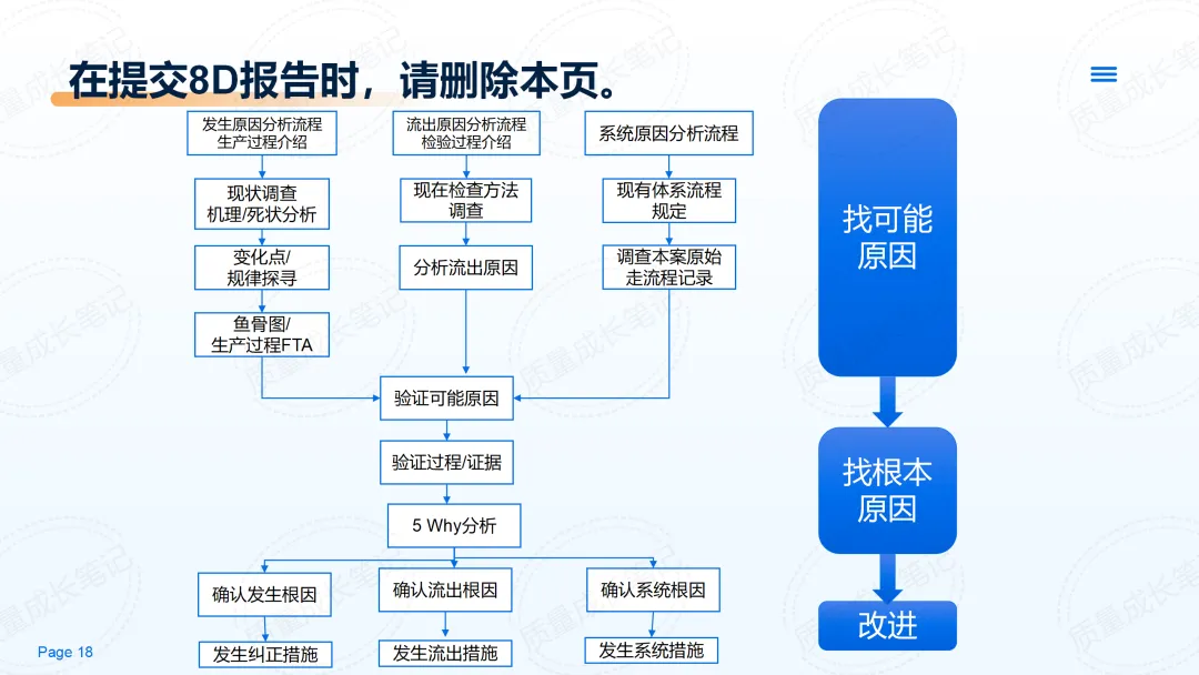 D1 组建团队:成立跨部门小组,明确组长和分工。 D2 描述问题:用5W1H量化问题,例如“某批次产品不良率5%,客户投诉”。 D3 临时措施:快速止损,如隔离不良品、紧急全检。 D4 根因分析:用鱼骨图、5Why等方法,区分“发生原因”和“流出原因”。 D5 制定长期对策:针对根因提出可执行方案,如优化设备参数。 D6 验证效果:用数据确认对策是否有效,比如不良率从5%降到1%。 D7 预防再发:将有效做法写入SOP或设备参数,避免反弹。 D8 总结复盘:记录经验、表彰团队,为后续案例沉淀资料。