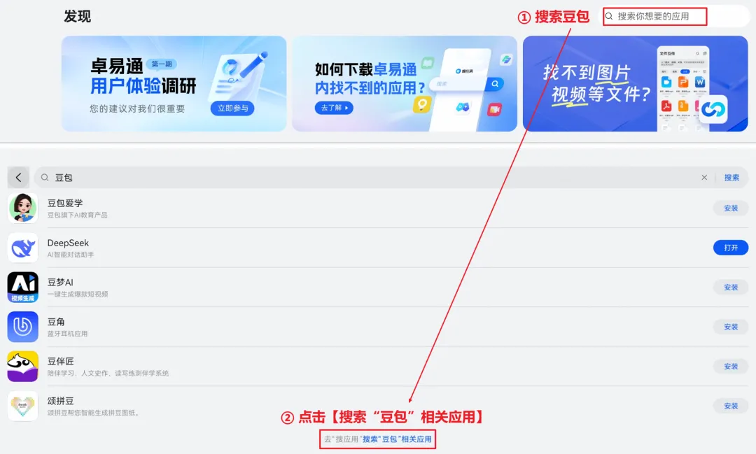 1.打开卓易通搜索豆包,点击【搜索“豆包”相关应用】。