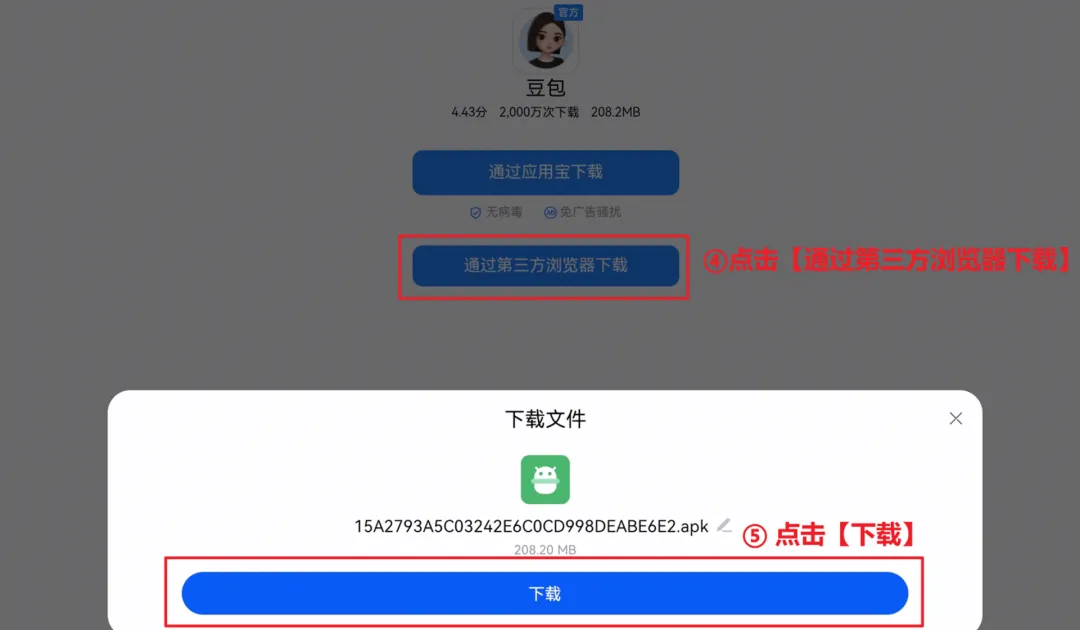 3.点击【通过第三方浏览器下载】,然后开始下载apk安装包,等待下载完成后,按照提示完成安装即可。