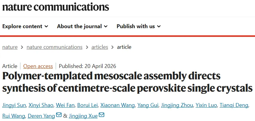 鉴于此,2026年4月20日浙江大学杨德仁&薛晶晶于NC刊发聚合物模板介观组装指导厘米级钙钛矿单晶的合成的研究成果,本文提出了一种通用的成核控制框架,该框架通过可逆的非共价相互作用将瞬态前驱体物种调控为介观尺度的团簇。