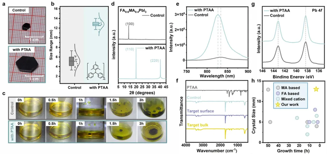 这种弱而动态的相互作用在成核前阶段提供了软约束,抑制了随机聚集,促进了选择性成核,并允许在不引入永久性添加剂的情况下形成有序晶格。该方法通过聚合物模板策略实现,可在数小时内形成厘米级钙钛矿单晶,并且广泛适用于各种钙钛矿组分,展现了其普适性。
