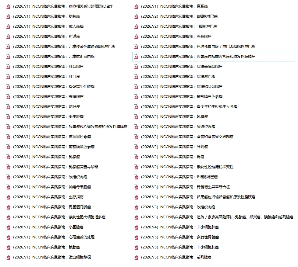 癌症治疗的进展步伐正在加快,NCCN指南更新迭代速度也在加快。小编整理了目前2026年第一季度NCCN发布的最新临床实践指南,仅供内部科研学习使用,请勿作商业用途。版权归NCCN所有。