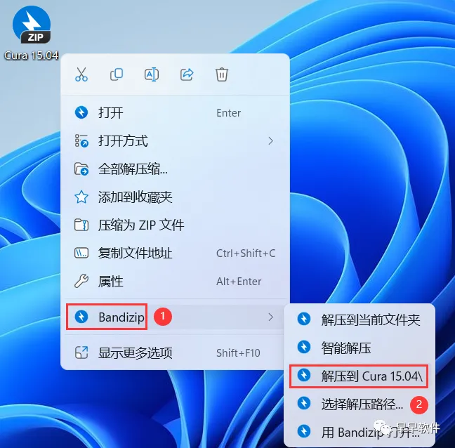 1、下载Cura 15.04软件安装包到电脑上,右键选择【解压到Cura 15.04\】