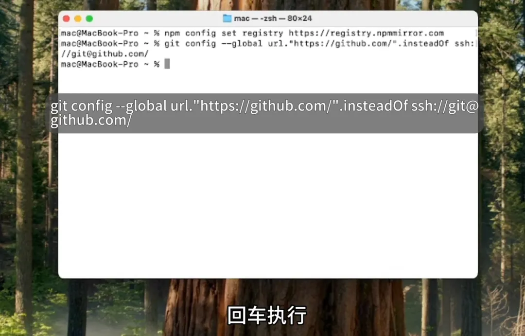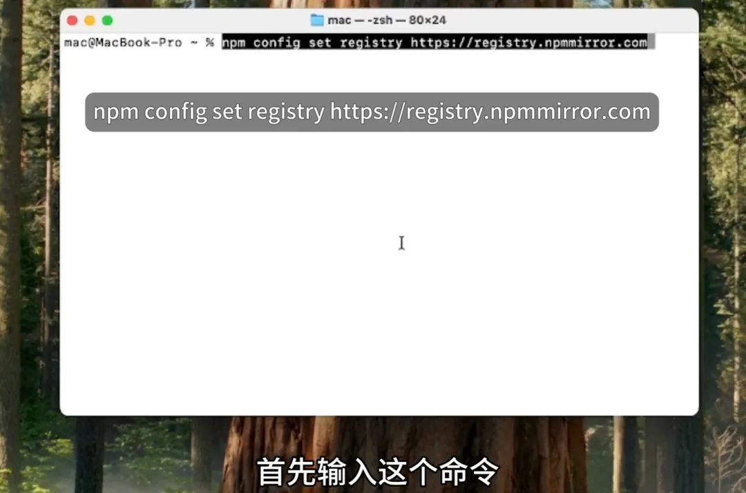 首先输入下方命令,将 npm 下载源切换为国内镜像,提高下载速度: