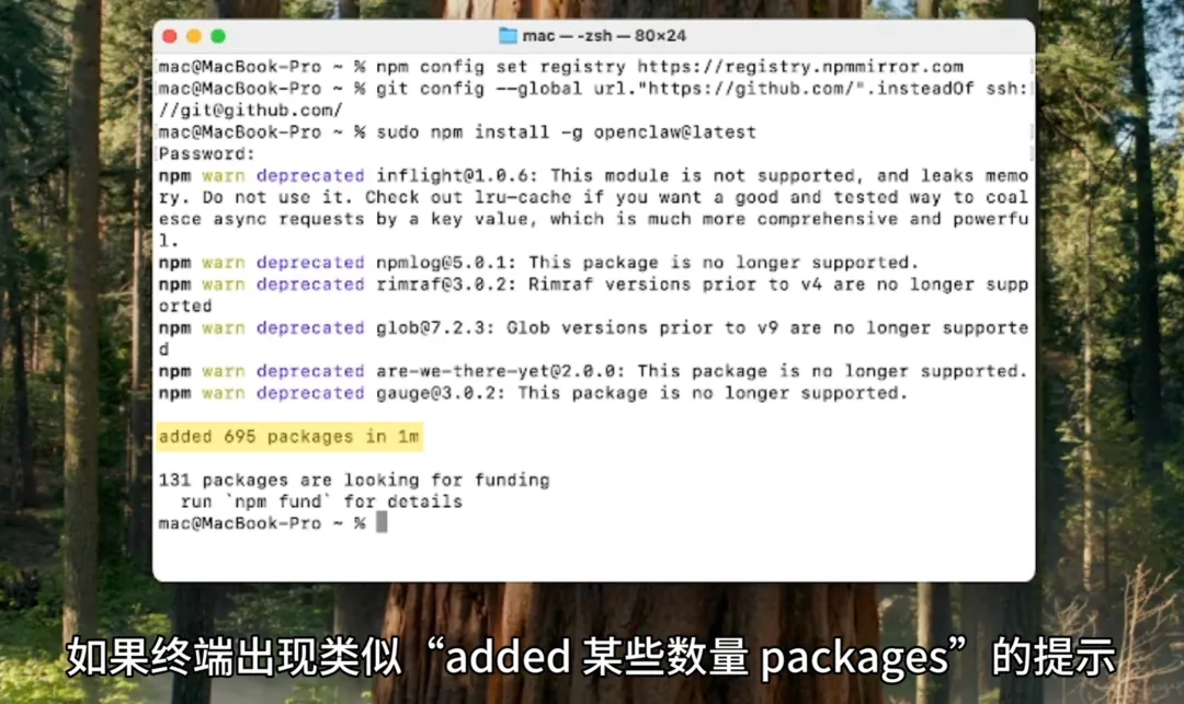 如果终端出现类似 added xxx packages 的提示,说明安装成功。