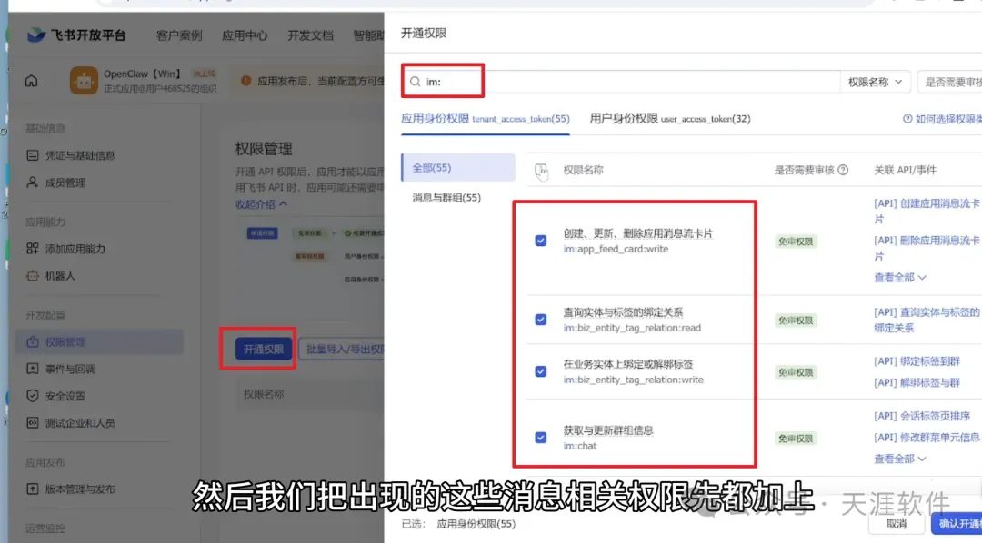 4.在权限管理中搜索 im: 并开通消息相关权限