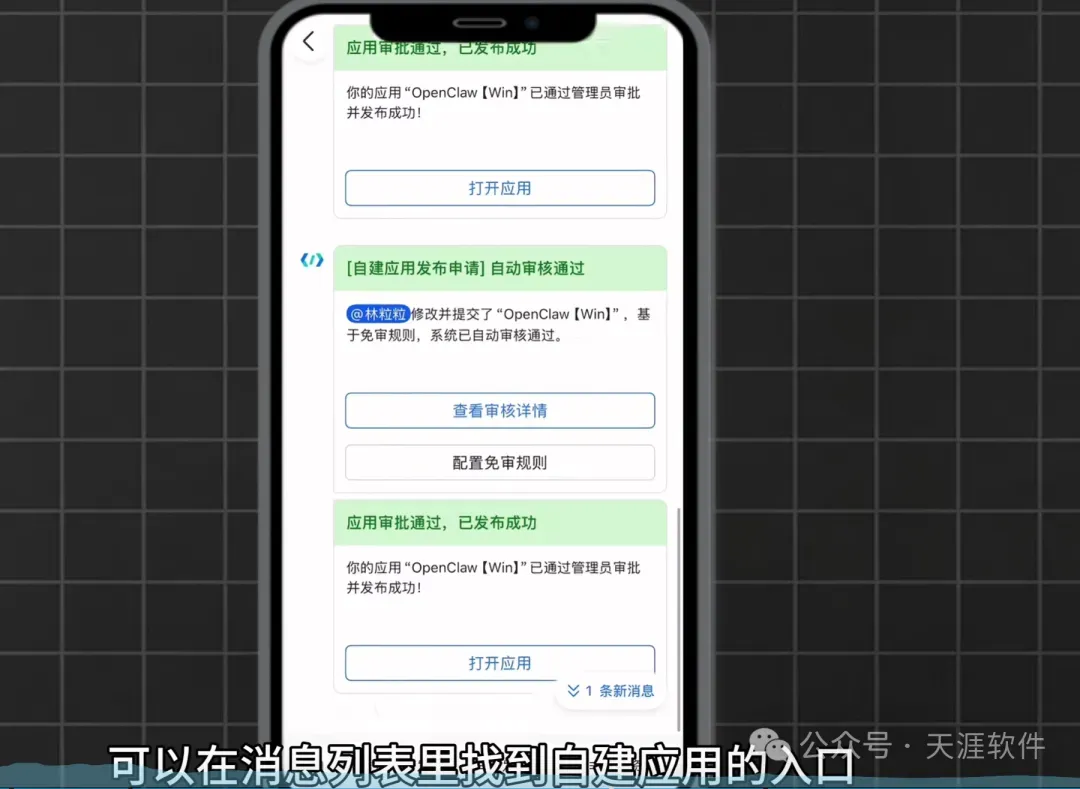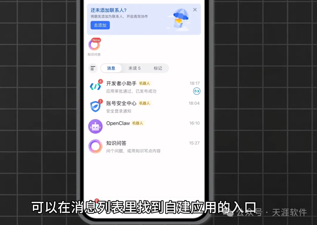 在消息列表中找到刚创建的应用,发送一条消息。