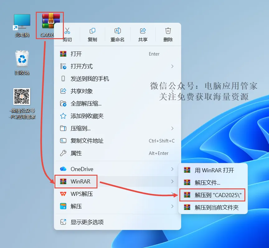 1.先下载好安装包,先点击一下压缩包,鼠标右键选“解压到CAD2025”。