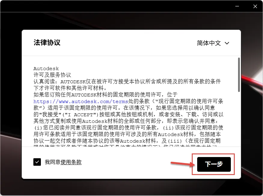 4.点击勾选“我同意……”,然后点击“下一步”。