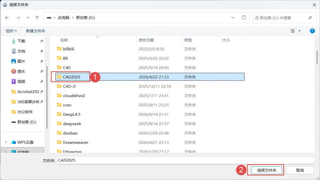 6.在D盘或者其他盘内新建一个文件夹,然后点击“选择文件夹”