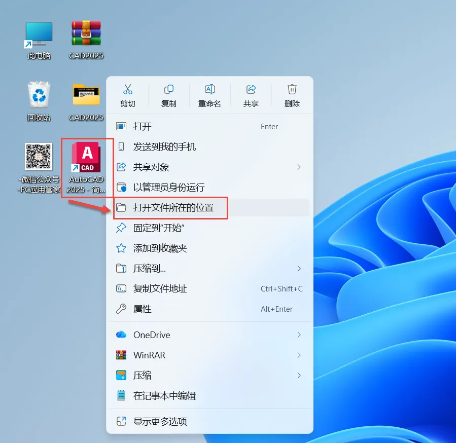 12.回到桌面,鼠标点击一下图标,右键选择“打开文件所在位置”。