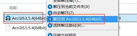 ArcGIS3.5.4(64bit)】压缩包②选择电脑上安装的解压软件③点击【解压到ArcGIS3.5.4(64bit)】。