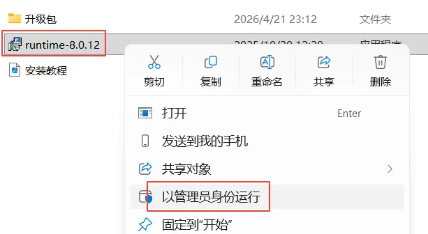 2.打开解压后的文件夹,鼠标右击【Runtime...】选择【以管理员身份运行】。