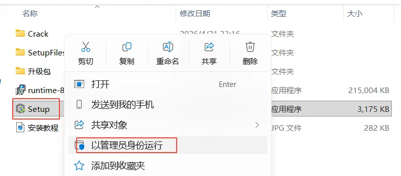 6.打开安装包解压后的【ArcGIS3.5.4(64bit)】文件夹,鼠标右击【Setup】选择【以管理员身份运行】。