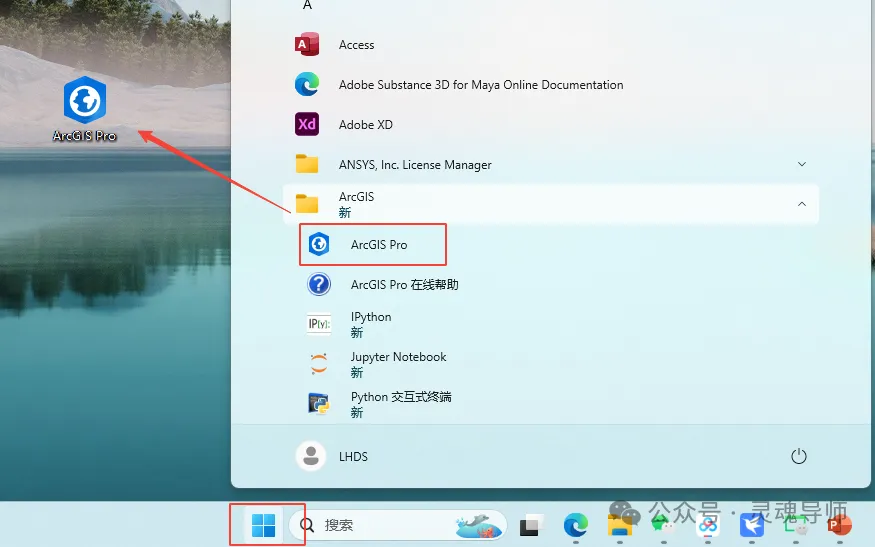 27.创建桌面快捷方式步骤:①点击桌面任务栏中的【开始图标】>点击【所有应用】>双击展开【ArcGIS】文件夹②将【ArcGIS Pro】图标拖到电脑桌面。