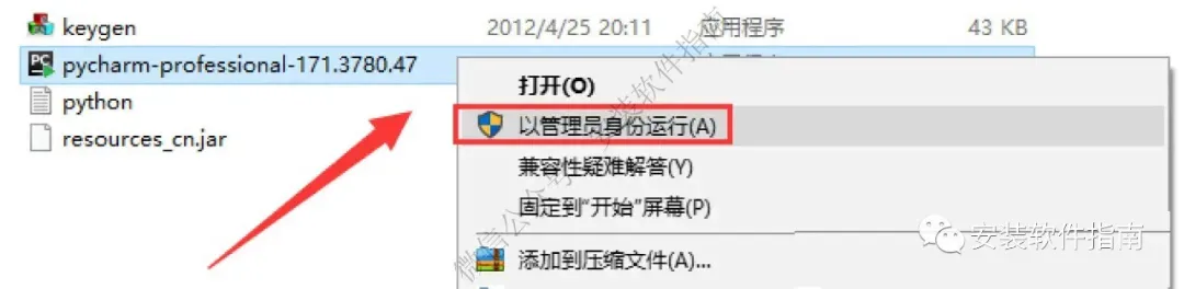 3.点【pycharm-professional-171.3780.47】并【以管理员身份运行】