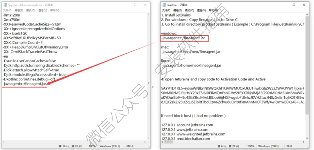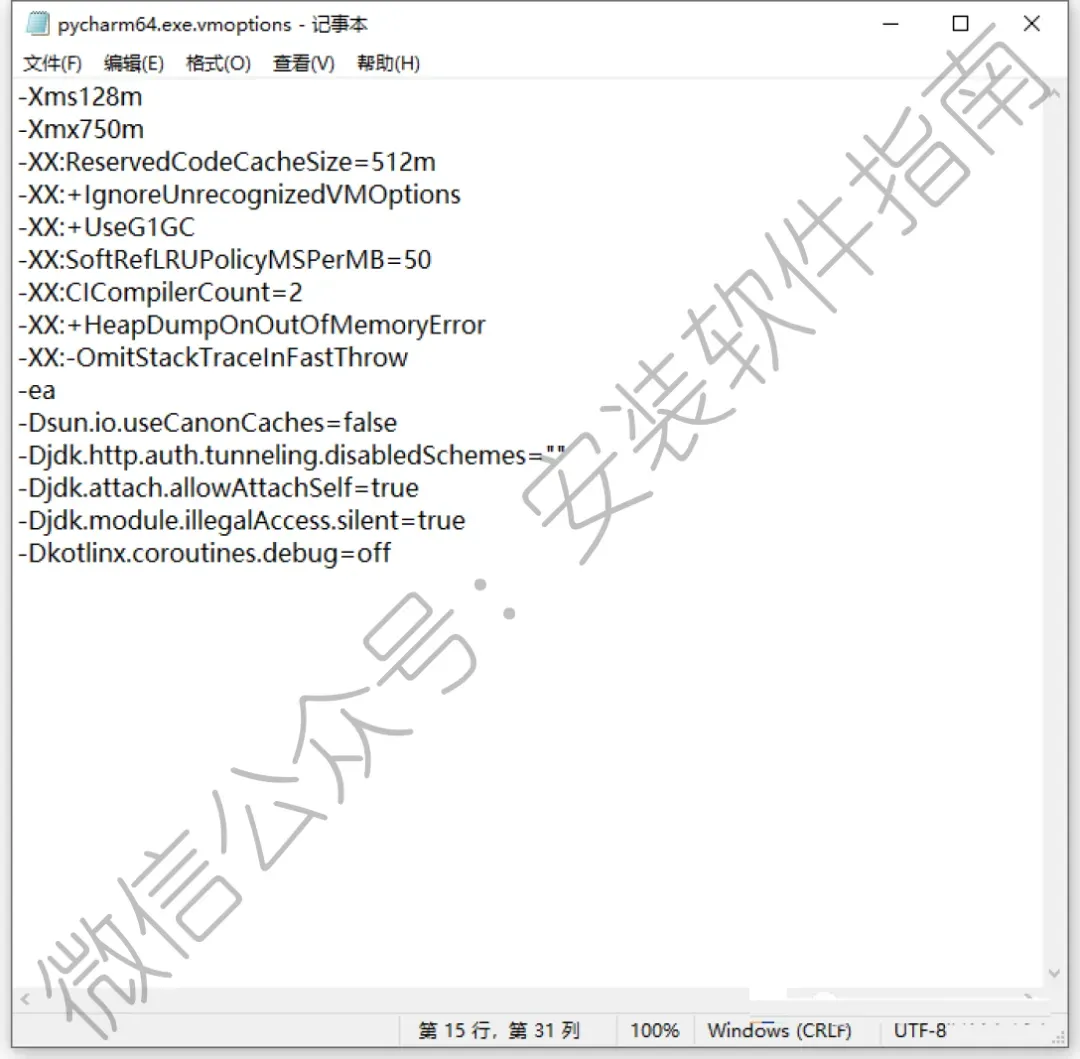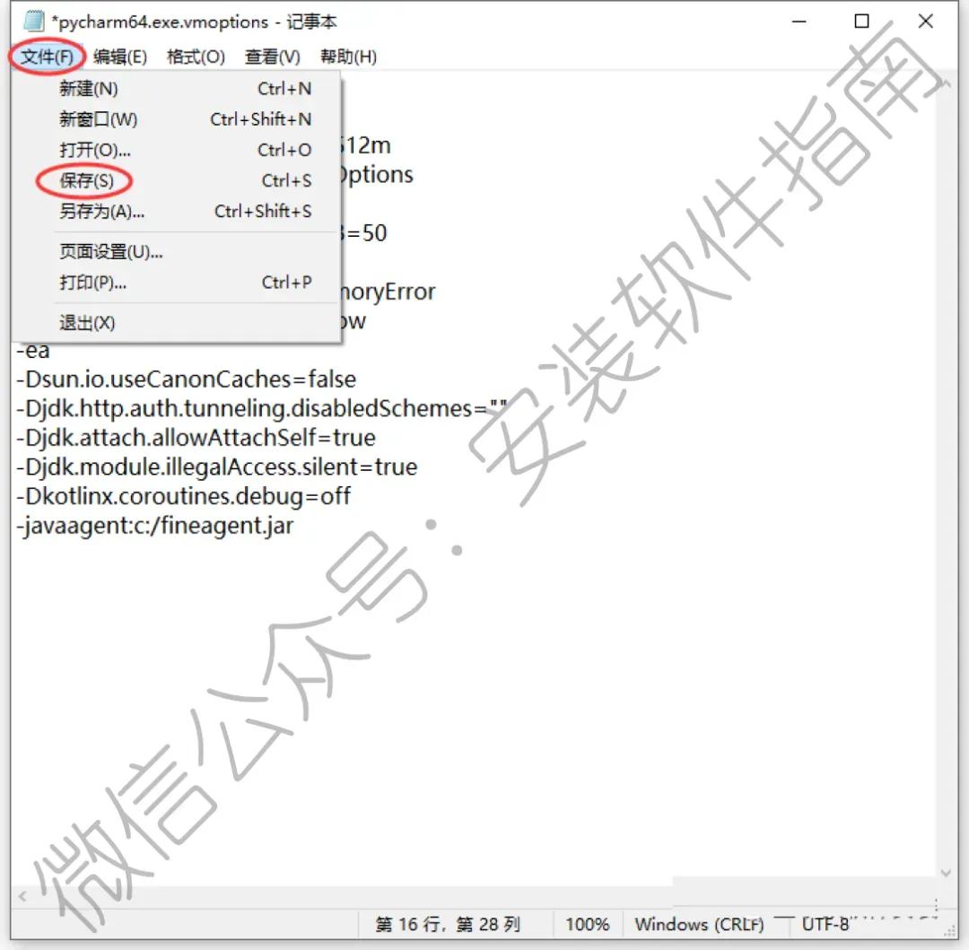 16、将 -javaagent:c:/fineagent.jar 这段代码复制粘贴到刚才打开的 pycharm64.exe.vmoptions 文件最下面