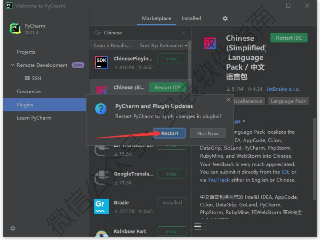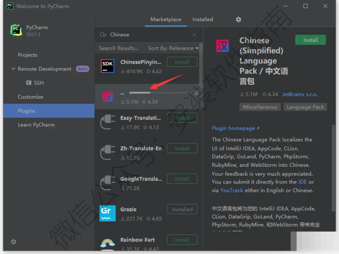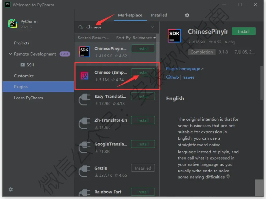 24、在上方搜索框中输入chinese,在出现的插件中,选择Chinese(Simplified)langua...简体中文语言插件,点击Install安装