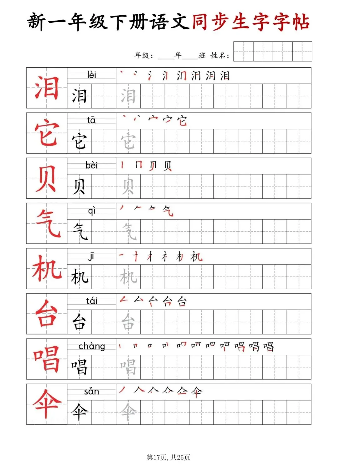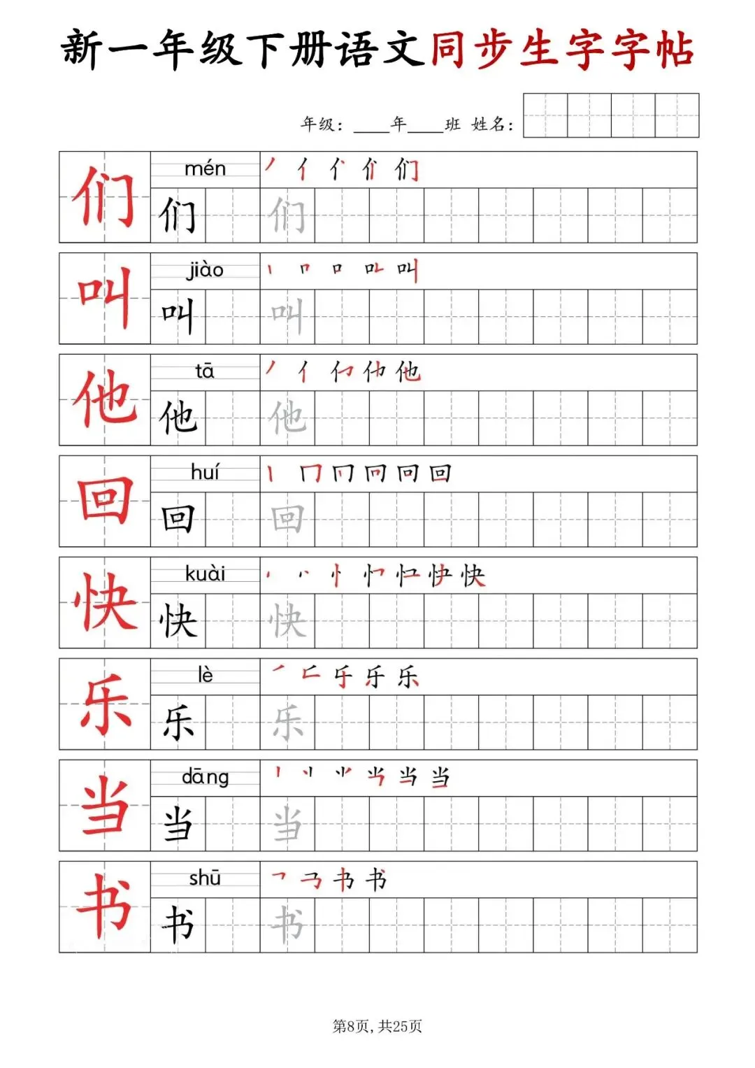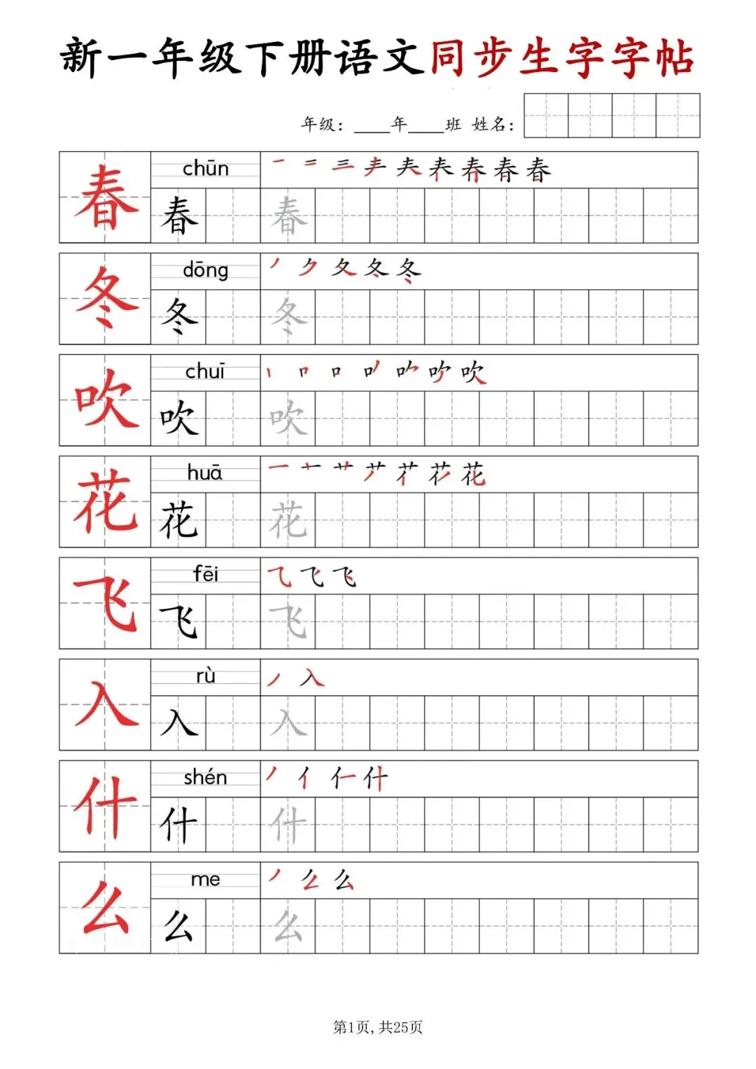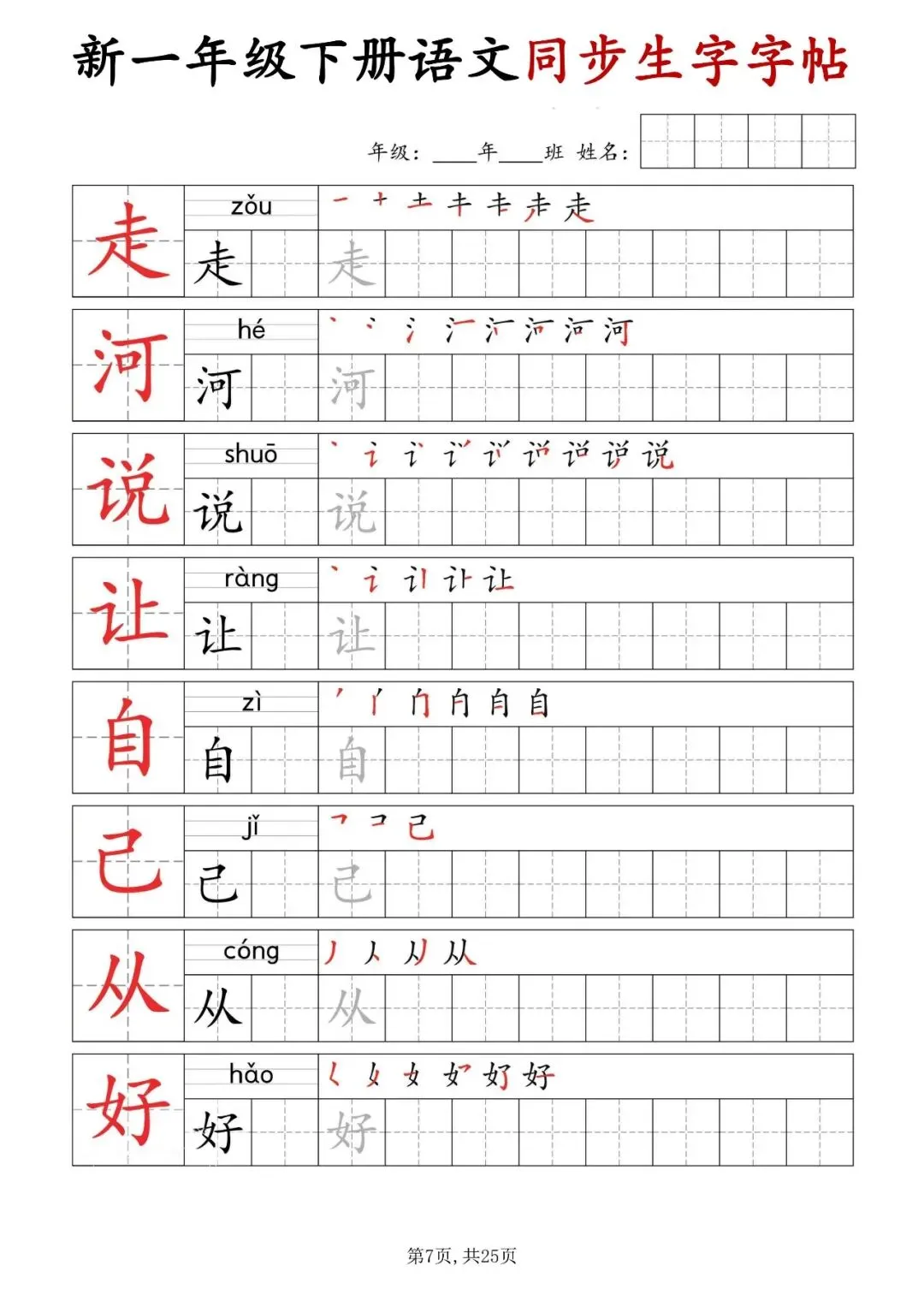 大家好,这里是淘学学资料库,这份《一年级下册语文同步生字字帖》,完整 pdf 电子档共 25 页。这本字帖完全同步一年级下册语文课本,收录全册所有必会生字,每个字都配有拼音、笔顺示范与描红格,从笔画到结构清晰呈现,孩子可直接描红、临摹,规范书写姿势与字形,轻松练出工整好字。字帖按课文顺序编排,生字排版宽松护眼,描红与临写结合,由浅入深帮助孩子掌握每一课的重点生字,既能巩固识字、记忆字形,又能提升书写速度与美观度,贴合低年级孩子书写习惯,适合日常练字、课前预习、课后复习使用,是夯实写字基础的优质同步练字资料。