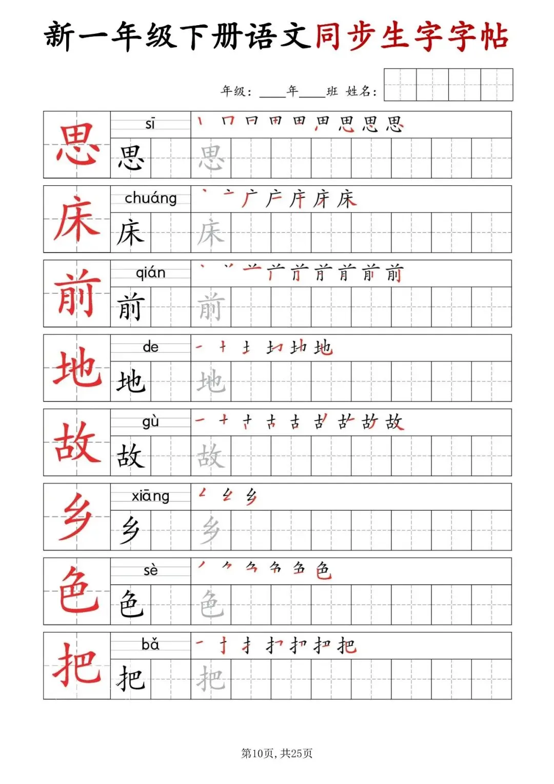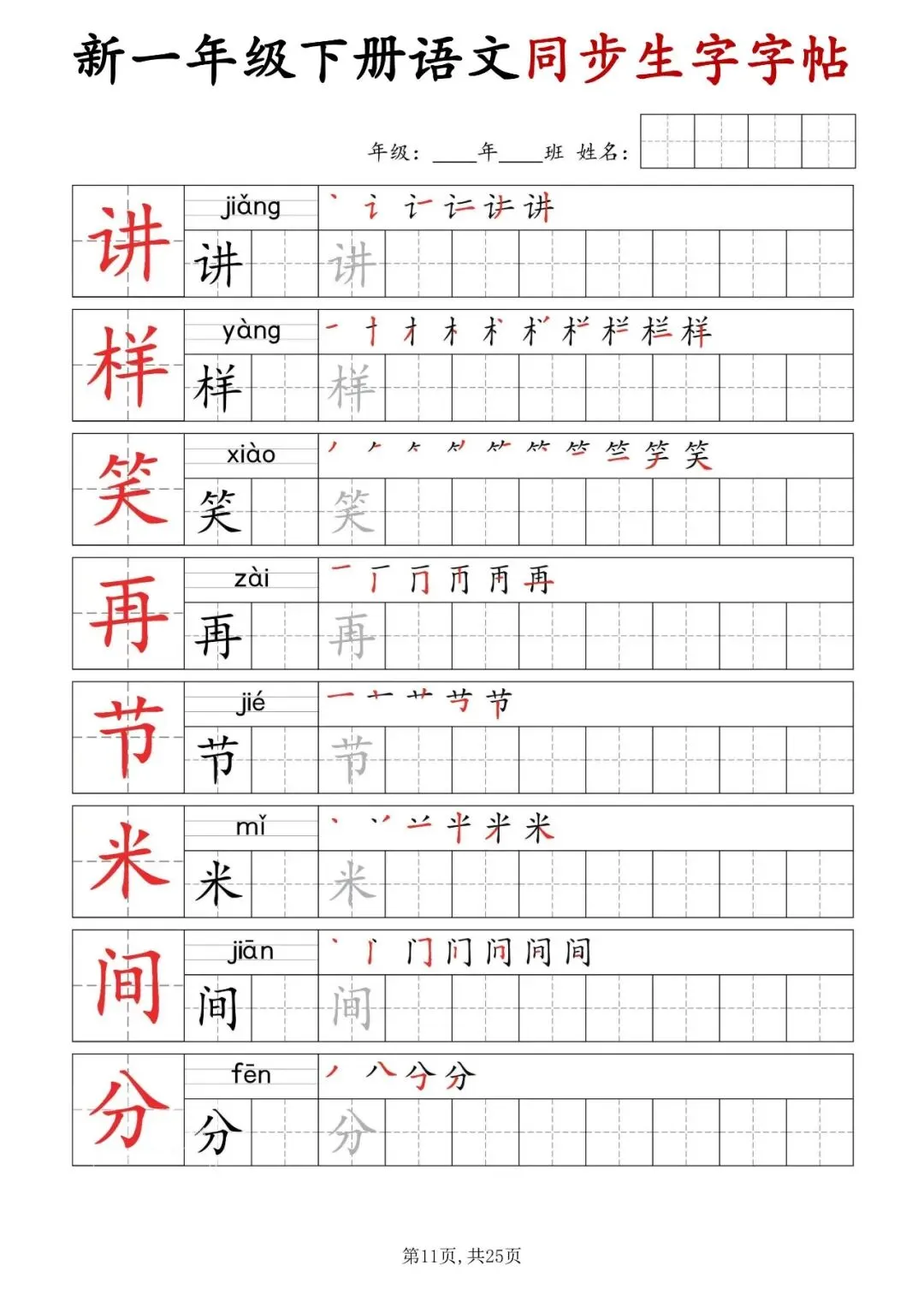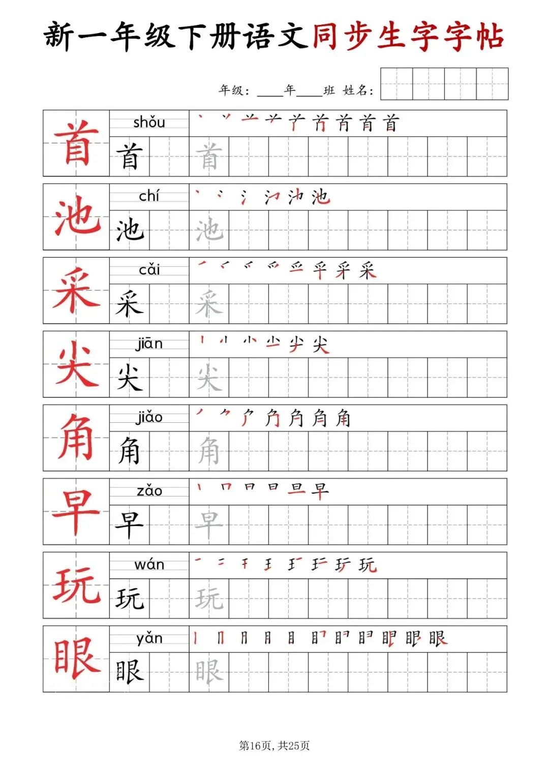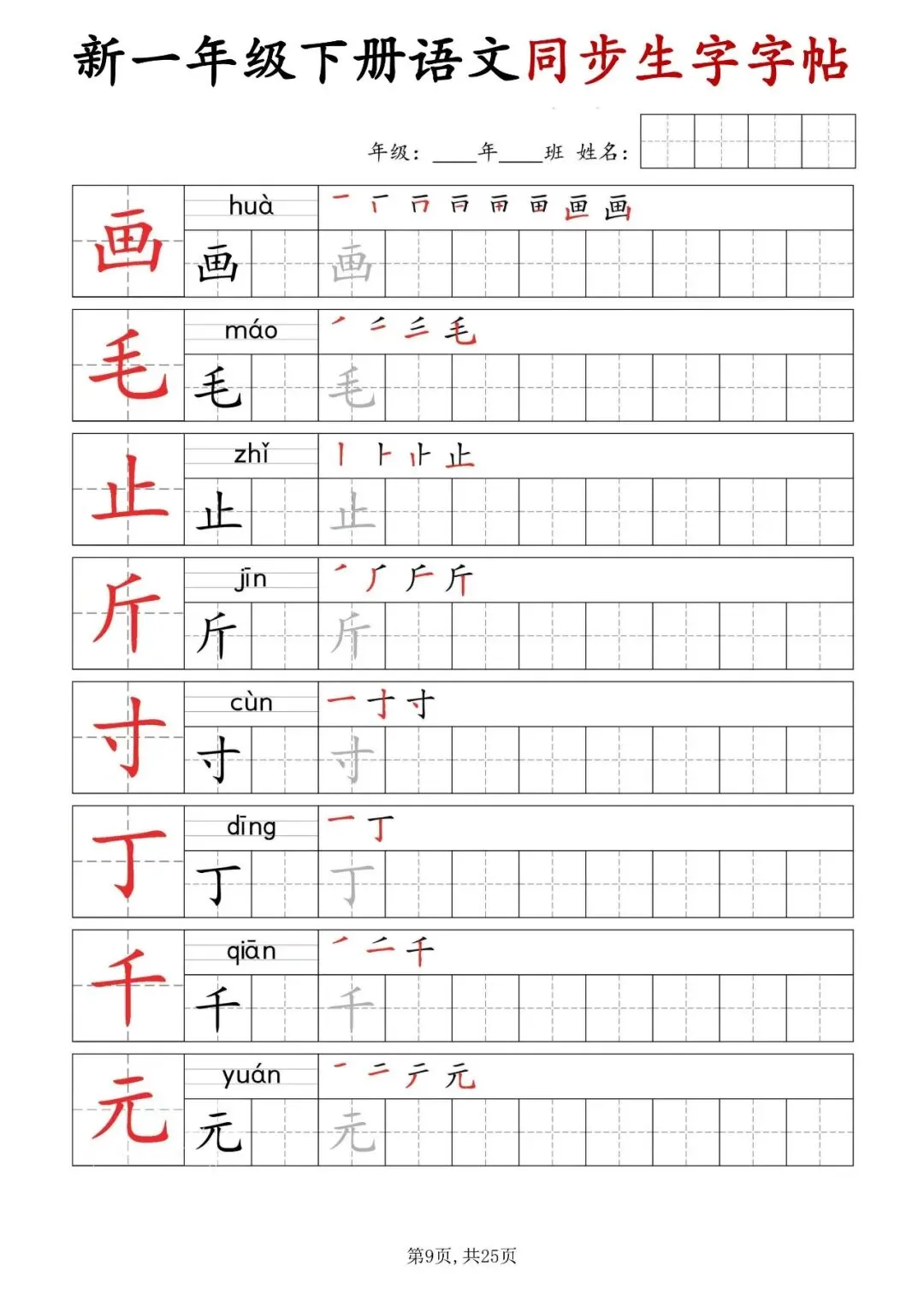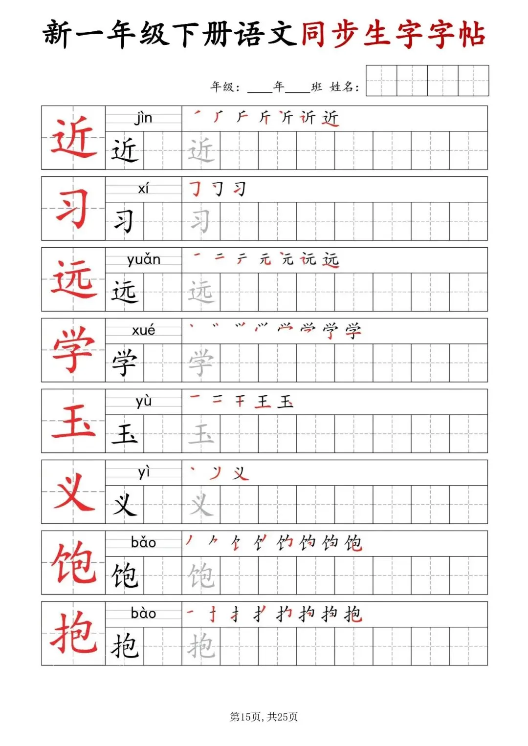 大家好,这里是淘学学资料库,这份《一年级下册语文同步生字字帖》,完整 pdf 电子档共 25 页。这本字帖完全同步一年级下册语文课本,收录全册所有必会生字,每个字都配有拼音、笔顺示范与描红格,从笔画到结构清晰呈现,孩子可直接描红、临摹,规范书写姿势与字形,轻松练出工整好字。字帖按课文顺序编排,生字排版宽松护眼,描红与临写结合,由浅入深帮助孩子掌握每一课的重点生字,既能巩固识字、记忆字形,又能提升书写速度与美观度,贴合低年级孩子书写习惯,适合日常练字、课前预习、课后复习使用,是夯实写字基础的优质同步练字资料。