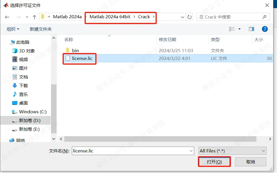 7、在解压后的文件夹Matlab 2024a文件夹中的【Crack】文件夹,选中license.lic文件,点击“打开”