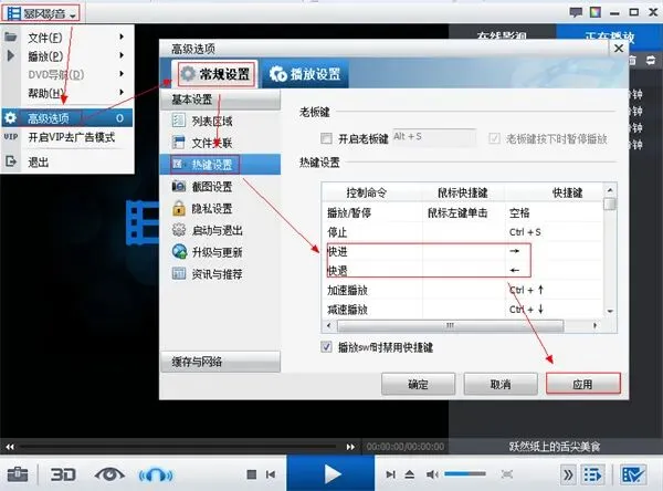 视频快退快进目前暴风暂时只支持本地视频和在线暴高清视频的快进/快退。暴风5的默认快进快退的快捷键为【快进 →】和【快退 ←】,可以使播放快进5秒或快退5秒。您可以进入高级选项——常规设置——热键设置中设置快捷方式。