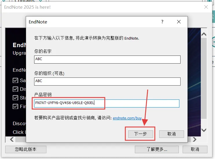 [温馨提示]:我们提供用户下载的所有内容均来自互联网。仅限技术交流,不得用作商业。开始教程:注意!!!开始解压安装前一定要退出杀毒软件 (不然会误删激活工具)(包括第三方杀毒软件和电脑自带、防火墙、Windows Defender和实时保护等会拦截删除激活文件,安装完再打开!)不会退出点击这里1.下载好的压缩包先解压出来,没有解压软件安装一个再操作。(推荐免费使用的Winrar解压软件,官方网址:https://www.winrar.com.cn/)2.双击打开解压好的【EndNote 21.5】文件夹。3.选中【Setup】程序,鼠标右键点击【以管理员身份运行】。4.点击【Next】。5.选择【I would like a free...】再点击【Next】。6.继续点击【Next】。7.选择【I accept the license...】然后点击【Next】。8.继续点击【Next】。9.点击【Browse...】更改安装位置。10.可以修改路径地址中的首字符C更改安装位置,如把C改为D代表软件将安装到D盘。(请记住这里选择的安装位置,后面激活需要用到)11.选择好点击【Next】。12.继续点击【Next】。13.等待程序安装完成。14.完成后点击【Finish】。下面开始激活教程:1.回到解压好的文件,双击打开【Crack】文件夹。(如果打开此文件夹是空的,一般是解压时没完全退出系统防护被拦截删除,按照文章开头教程退出重新解压即可恢复)2.选中【EndNoteCHS】程序,鼠标右键进行【复制】操作。(也可以直接选中Ctrl+C键复制)3.打开安装步骤10中自己选择的安装路径,鼠标移动到空白处右键选择【粘贴】。(或者直接Ctrl+V进行粘贴)4.创建桌面快捷方式图标:选中粘贴过来的【EndNoteCHS】程序,鼠标右键点击【发送到】—【桌面快捷方式】。5.回到【Crack】文件夹,选中【Keygen】程序,鼠标右键选择【以管理员身份运行】。6.点击【GENERATE】生成密钥。7.点击【COPY】复制密钥,再点击【EXIT】退出。8.返回电脑桌面,双击打开刚才创建的快捷方式启动程序。9.弹窗点击【Activate】。10.你的名字和你的组织随便输入,然后点击产品密钥框,鼠标右键把刚才复制的密钥【粘贴】到这里。11.粘贴好点击【下一步】。12.选择【我接受许可协议】再点击【下一步】。13.弹窗点击【确定】。14.点击【忽略此版本】。15.继续点击【忽略此版本】。16.点击【Create a new library】。17.自己选择文档需要保存的位置点击【保存】即可。18.到此中文版安装完成。英文版设置方法:1.点击桌面任务栏中的【开始图标】>展开【所有应用】,找到【EndNote】图标,拖动到电脑桌面即可创建英文版桌面快捷方式。2.双击【EndNote图标】即可进入英文版。3.到此安装完成,可以开始使用!下面是一些常见问题与解决方法:常见问题:EnNote在线检索功能不能连接到服务器解决方法如下:1.点击电脑任务栏【开始菜单图标】,再点击【设置】。2.搜索【控制面板】打开。3.查看方式选择【大图标】,再打开【Internet选项】。4.点击【高级】选项,取消勾选【检查发行商的证书...】和【检查服务器证书...】,再勾选上【使用TLS1.0】、【使用TLS1.1】、【使用TLS 1.2】,选好点击【确定】5.可以重启电脑再打开EndNote。启动后点击【PubMed(NLM)】即可链接上。如果还链接失败可以按照下面方法检查一下:点击电脑任务栏【开始菜单】,再点击【设置】进来点击【网络和Internet】点击【代理】,把手动设置代理下方的【使用代理服务器】关闭,再重新打开基本就可以连上了。还有一些朋友反馈使用Endnote在线检索功能时用【PubMed】可以使用,但【Web of Science】的就链接不上不能使用了。这是因为【PubMed】是免费使用,但是【Web of Science】在线检索是需要有授权的IP,例如一些学院和单位的IP购买了数据库链接就可以使用,如果没有购买数据库,那自然使用不了【Web of Science】检索。