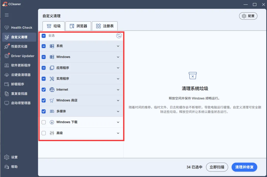 自定义清理支持清理:系统、应用程序、应用商店、注册表、浏览器等