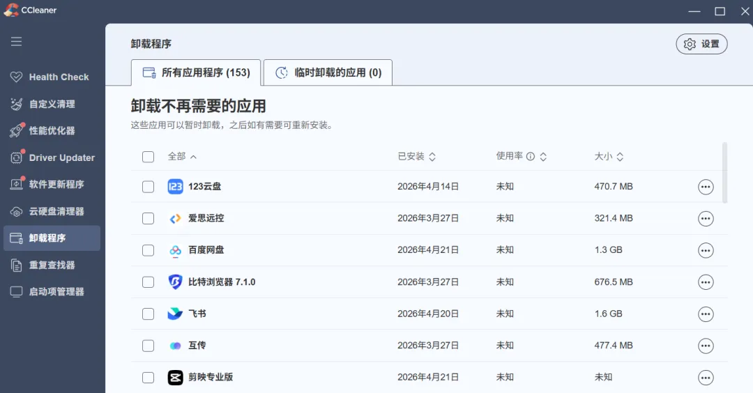 1. 全新的卸载引擎 :能一次性卸载多个软件,避免弹窗,还能暂时删除测试性能,想恢复随时可以恢复!2. 磁盘分析器升级 :分析大量重复文件,支持预览查看,删除方式更多样,界面全新设计支持深色模式!3. 云硬盘清理器 :接管Google Drive和OneDrive,找重复文件、大文件、旧文件,快速查看释放空间!4. 性能优化功能 :专利技术让PC提速34%,电池续航延长30%,游戏体验更流畅!5. 驱动更新功能 : 改善PC视觉效果、声音效果和网络连接,防止软件错误和崩溃!6. 软件更新功能 :自动更新所有软件,在安全漏洞被发现前就清除,省时省力!7. 健康检查功能 :全面分析PC,推荐快速修复方案,自动调整更新!