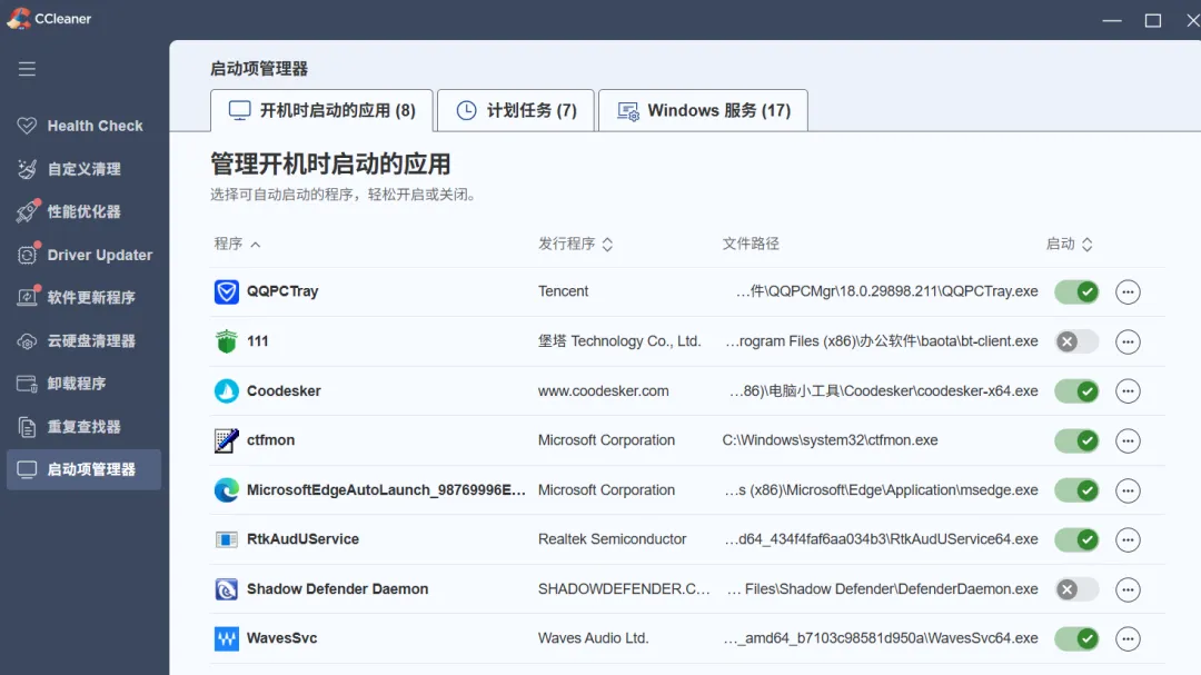 除了清理,它还能优化系统:不管是临时文件夹、浏览痕迹,还是注册表里的多余条目,都能一并处理,顺手还能帮你管理启动项和卸载软件,功能相当齐全。
