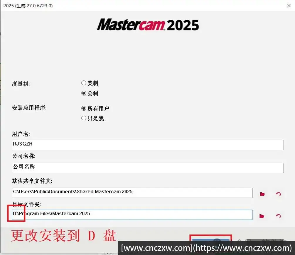 6.选择公制 选择所有用户 更改安装目录到 D 盘 点击完成