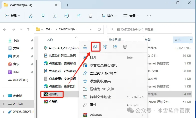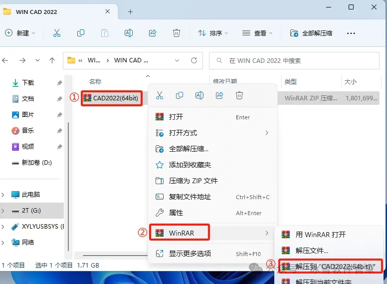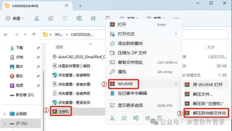 10.打开安装包解压后的【CAD2022(64bit)】文件夹,①鼠标右击【注册机】压缩包②选择电脑上安装的解压软件(如:WinRAR压缩)③点击解压到【解压到当前文件夹】。