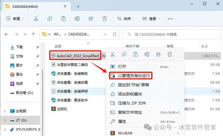 2.打开解压后的文件夹中,鼠标右击【AutoCAD_2022_Simplified_Chinese_Win_64bit_dlm.sfx】选择【以管理员身份运行】。