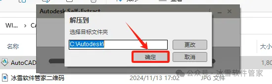 3.点击【确定】(注:解压的安装包默认在C盘,若C盘容量不够可点击更改更换解压路径,软件安装完成后可删除此文件夹)。