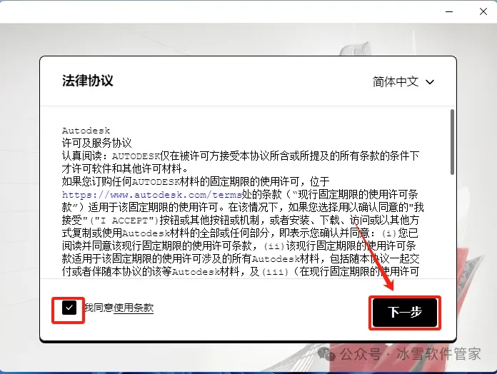 4.勾选【我同意使用条款】,点击【下一步】。