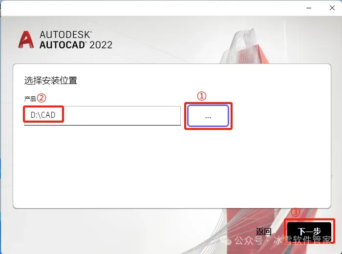 5.①点击【…】,②选择软件安装位置(建议不要安装在C盘,可在D盘或其它磁盘下新建一个“CAD”文件夹。注:安装路径中不能有中文),③点击【下一步】。