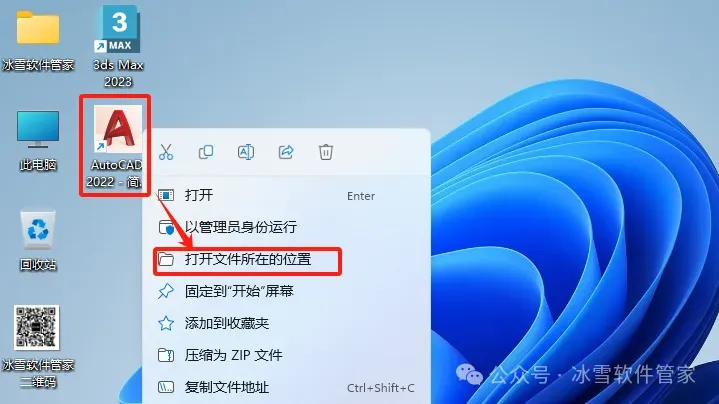 12.鼠标右击桌面【AutoCAD 2022 - 简体中文 (Simplified Chinese)】图标选择【打开文件所在的位置】。
