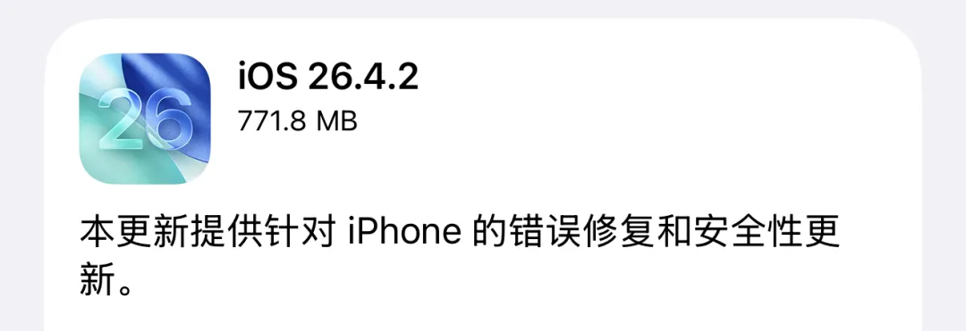 北京时间 4 月 23 号凌晨,苹果发布了 iOS 26.4.2 正式版系统。本次没有肉眼可见的更新内容,为「纯安全性」更新。