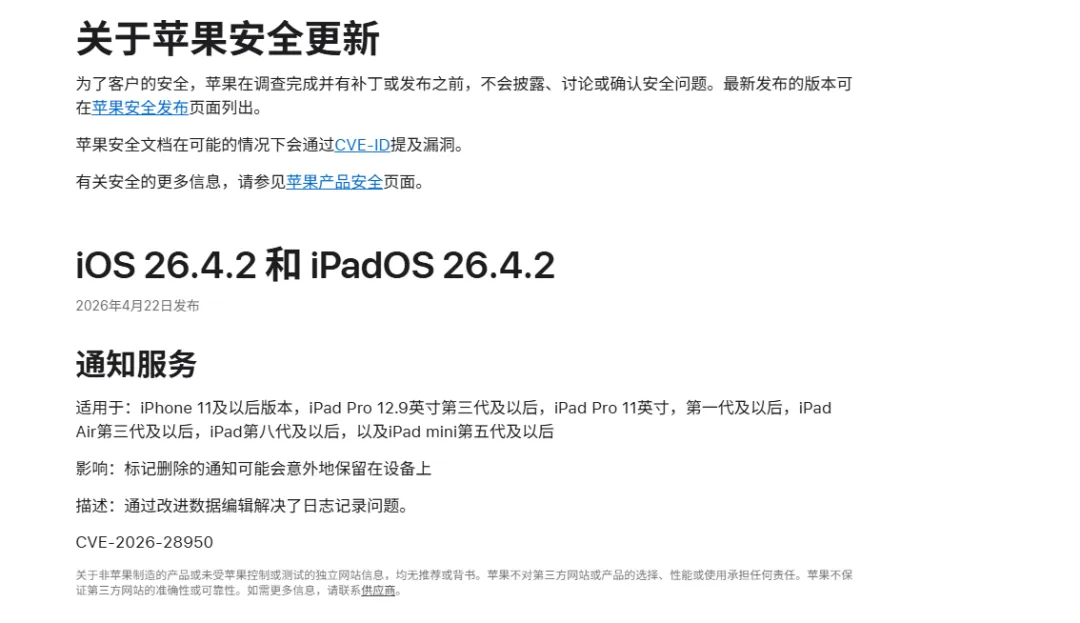 iOS 26.4.2正式版紧急推送,修复“通知意外保留”Bug!不出所料,苹果在今日凌晨为广大iPhone用户推送了iOS 26.4.2正式版的更新。想要升级的用户可直接打开设置--通用--软件更新,在线OTA升级至最新的iOS 26.4.2正式版。本次更新包大小为771M左右,内部版本号23E261,从已更新的用户反馈来看,iOS 26.4.2并未带来明显新功能,主要是修复了允许恢复已删除通知的漏洞。苹果在其官方网页关于iOS 26.4.2安全更新的介绍中,着重提到了通知服务方面的问题。此前,存在这样一个隐患:那些被标记为删除的通知,可能会意外地仍保留在设备上。具体来说,是由于日志记录方面存在问题,导致数据未能得到妥善处理。而苹果在iOS 26.4.2中通过改进数据编辑(redaction)功能,成功解决了这一日志记录问题。据苹果向外媒9to5Mac透露,他们留意到有报告称,一些来自应用程序的推送通知,在本应被删除的情况下,却依旧留存在设备上。这一情况引起了苹果的高度重视,随后他们迅速定位到了相关漏洞,并在 iOS 26.4.2 中实施了修复措施。值得一提的是,此次更新不仅修复了漏洞,还会对设备上意外存储的通知副本进行追溯清理,确保用户设备上的通知信息得到彻底清除。虽然苹果没有明确说明,但9to5Mac推测,iOS 26.4.2正式版修复的漏洞很可能是对近期一则涉及FBI的报道做出的回应。此前有消息称,FBI成功从一名被告的iPhone中检索到了Signal应用的通知,即便该Signal应用已经被删除。iPhone17已经上市,256GB起步,6.3寸更大屏幕,120HZ高刷等良心升级,今年肯定会大卖!如果您家里有闲置手机趁现在高价出掉,很多人把闲置的手机一直放着,最后只能换不绣钢脸盆!(估价满意后再加回收专员:gfzjxm)