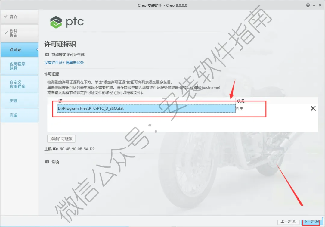 16.点系统会自动识别到许可路径,(如果没有识别,点击【添加许可证源】,选择到D:\Program Files\PTC\PTC_D_SSQ.dat 路径即可),然后点击【下一步】
