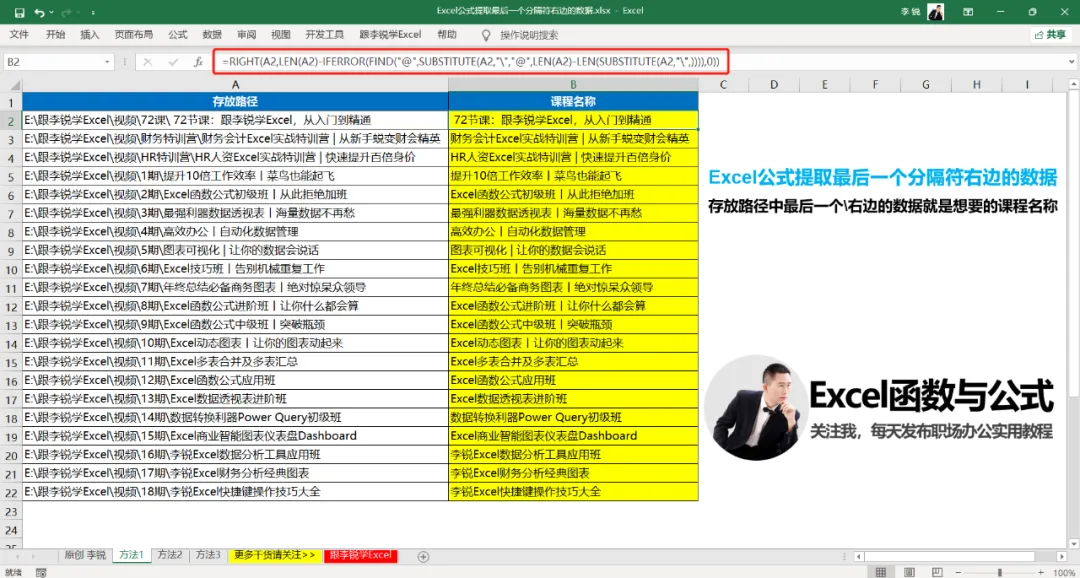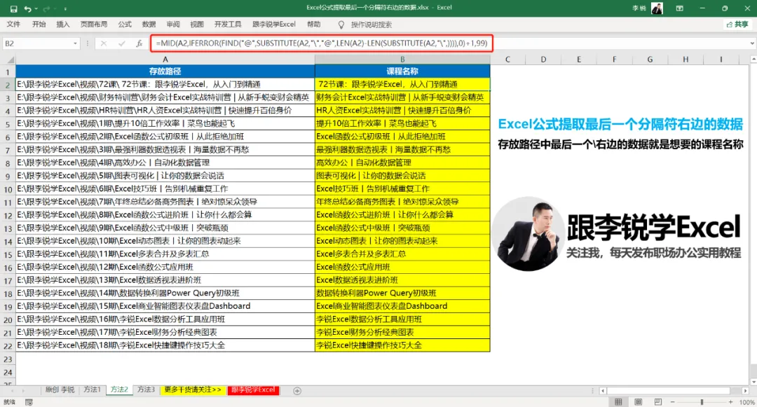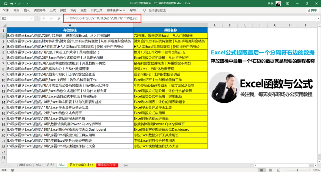 先来看个简单示例,左列是一大串存放路径,要求你从中提取最后一个\右边的课程名称,你想想看,自己会写公式吗?