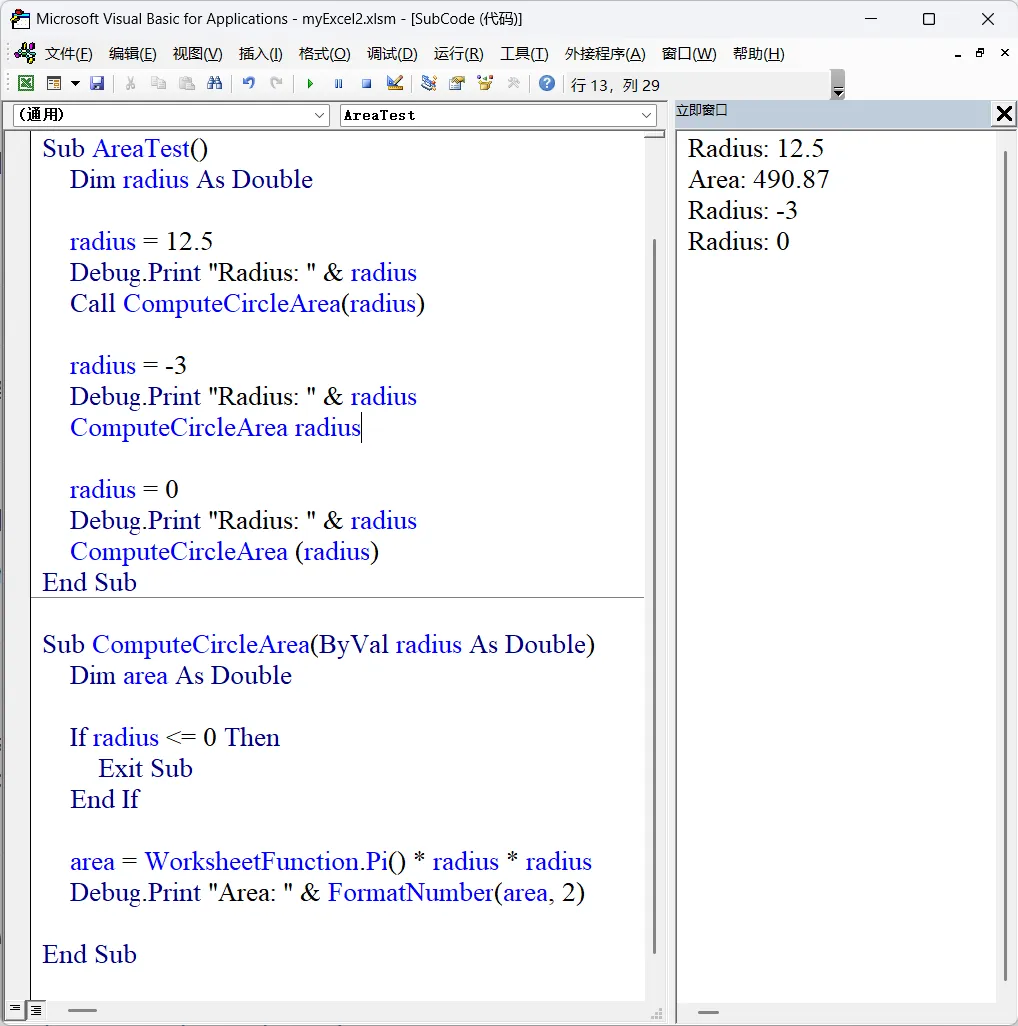 Sub ComputeCircleArea(radius)Dim area AsDoubleIf radius <=0ThenExit SubEnd Ifarea = WorksheetFunction.Pi() * radius * radiusDebug.Print "Area: " & areaEnd Sub