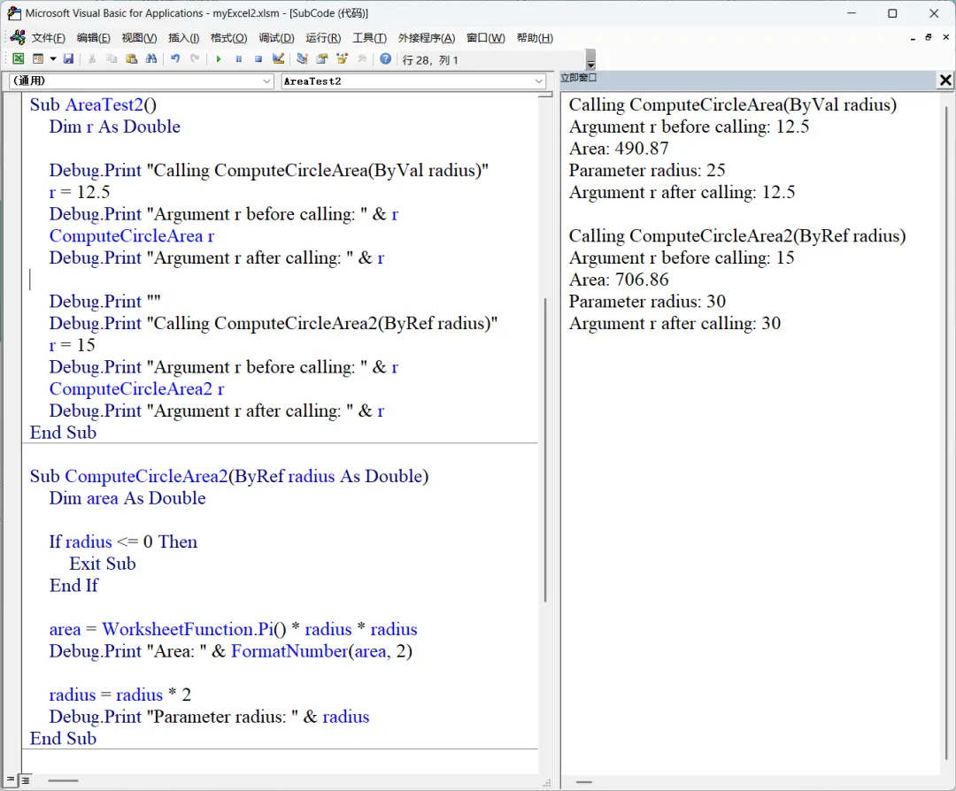 ByRef:这是 VBA 的默认传递方式。在这种传递方式中,参数 radius 从 AreaTest 过程传递到 ComputeCircleArea,传递的是 radius 在 AreaTest 过程中的地址。 ByVal:这种传递方式传递的是参数的值。这也是图1 中的 ComputeCircleArea 过程声明的方式。