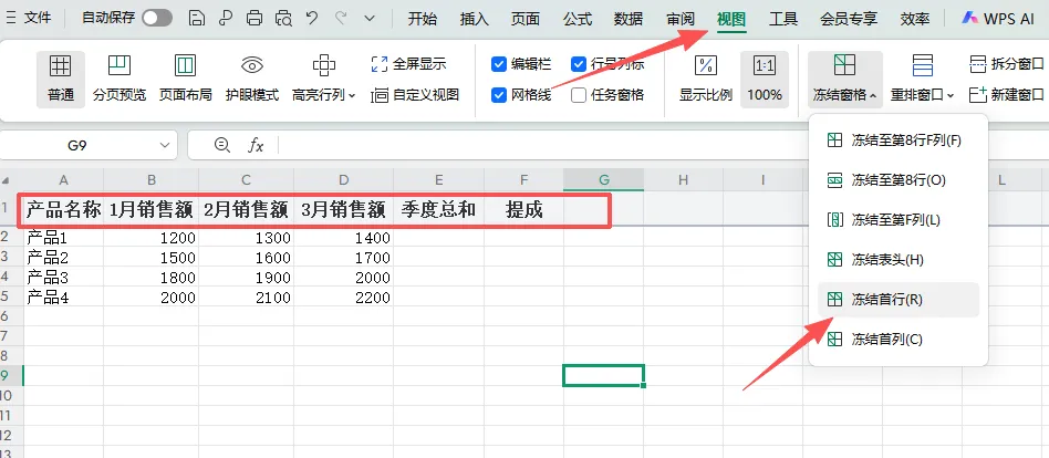 1. 冻结(固定)首行(向下滚动,表头焊死不动)
