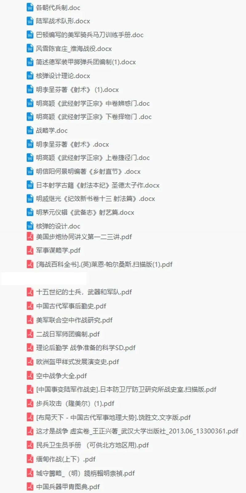 包括各朝代兵制研究、陆军战术队形分析、第二次世界大战史实记录、美国步炮协同讲义、巴顿编写的美军骑兵马刀训练手册等珍贵资料。此外,还有海战百科全书、民兵常识、十五世纪的士兵武器研究、淮海战役回忆录、中国古代军事后勤史、美军联合空中作战研究等内容。