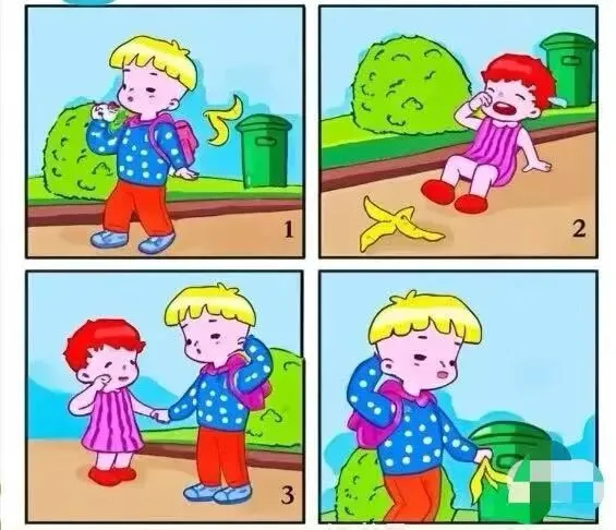 这时,后面传来了哇哇大哭的声音,小明回头一看,原来一个小妹妹不小心一脚踩在了香蕉皮上摔倒了。