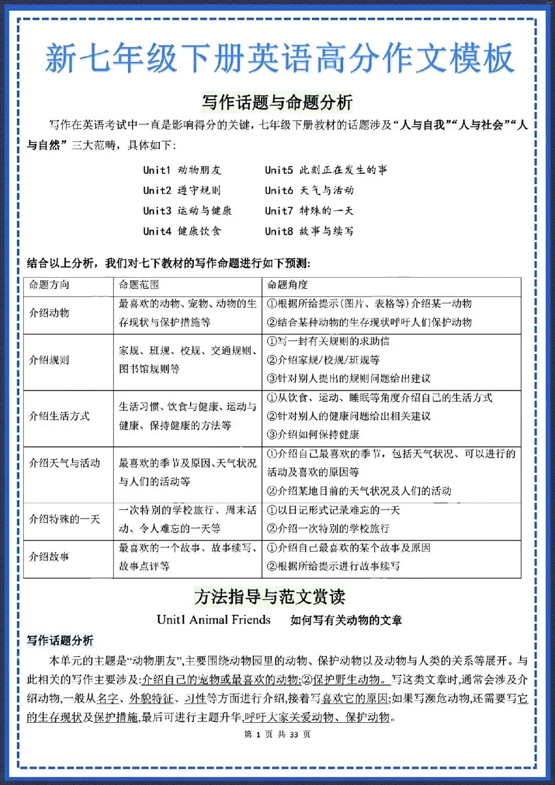 下学期提高英语作文的方法!初一专属满分模板,直接套用就可以拿到高分