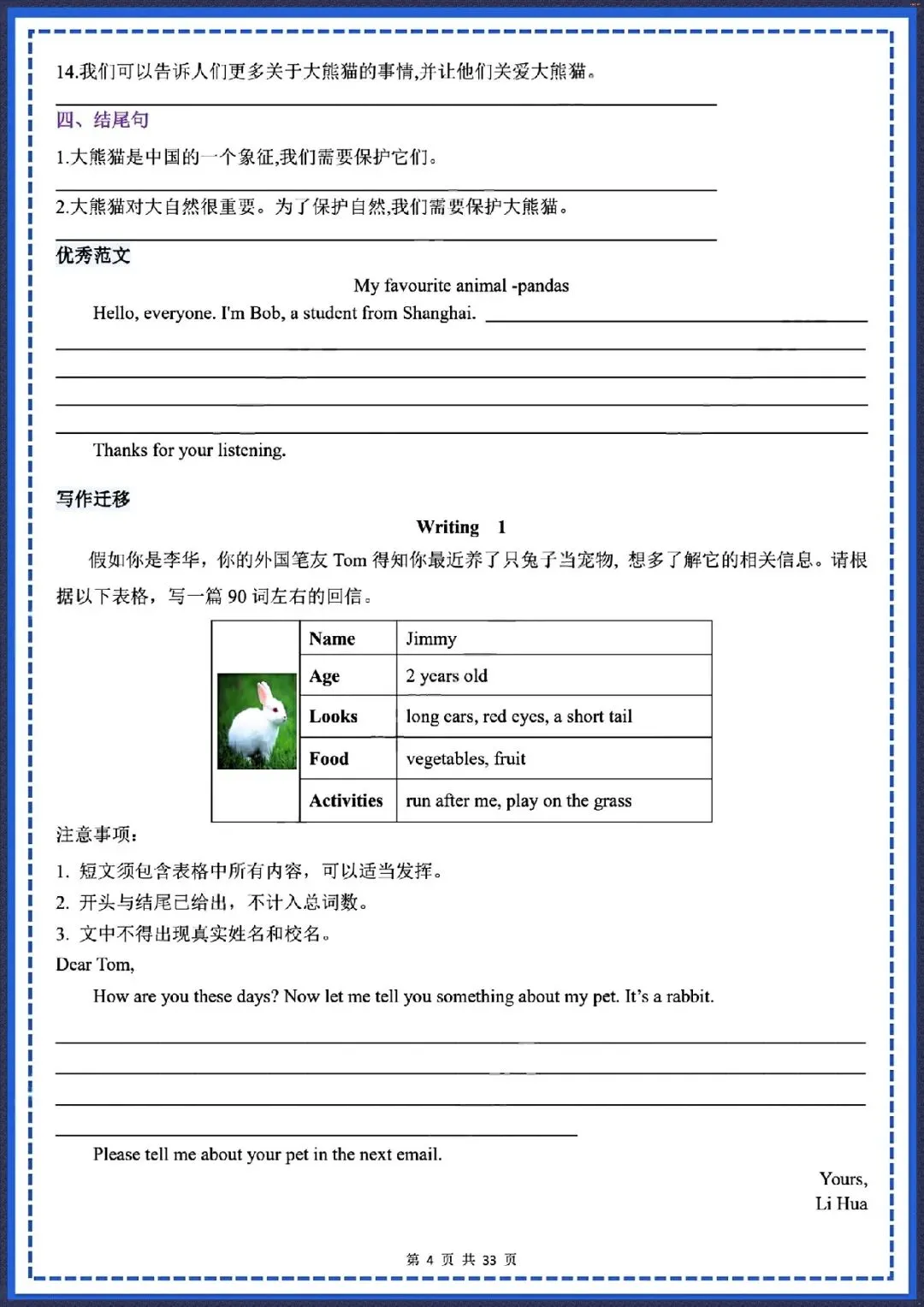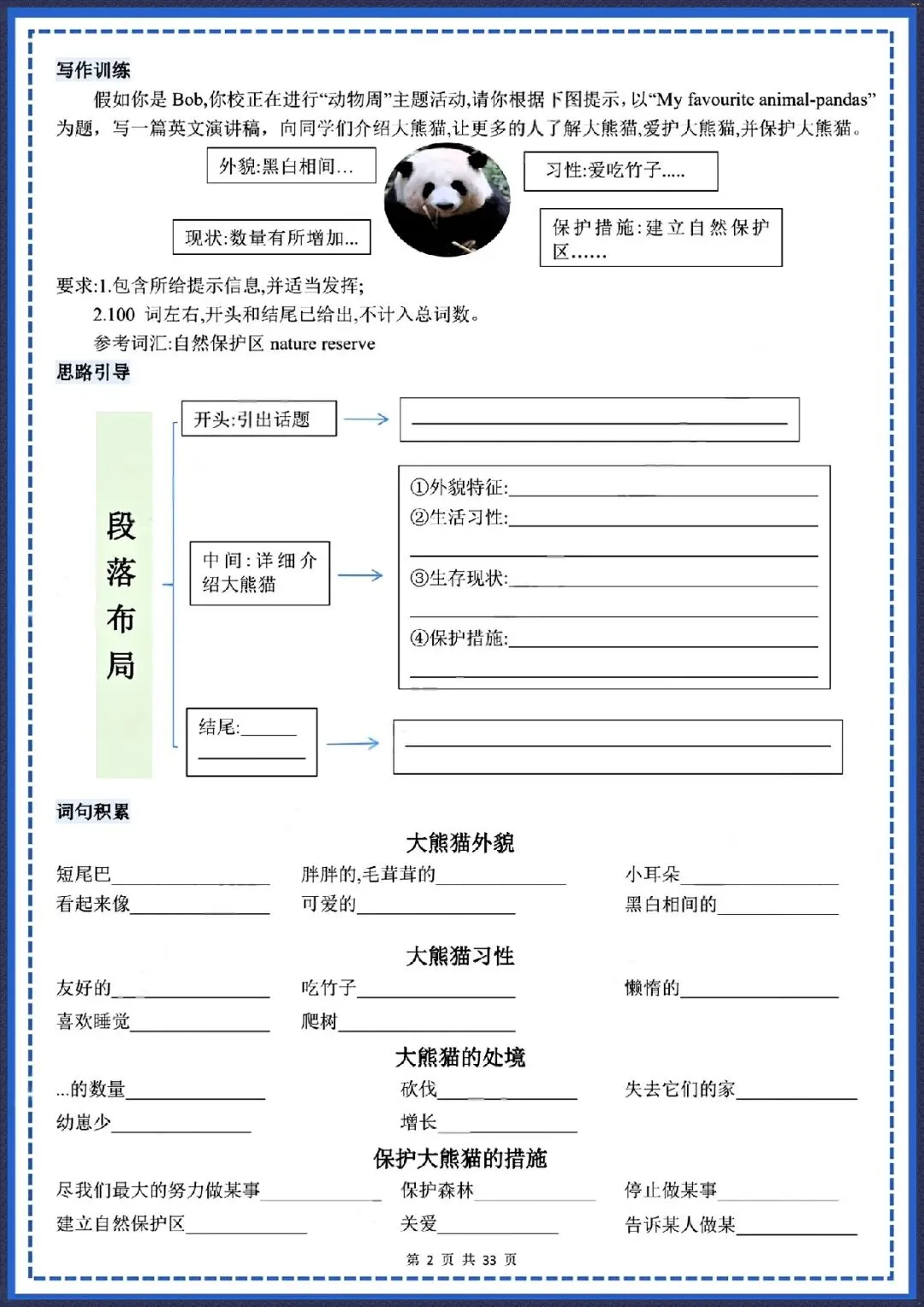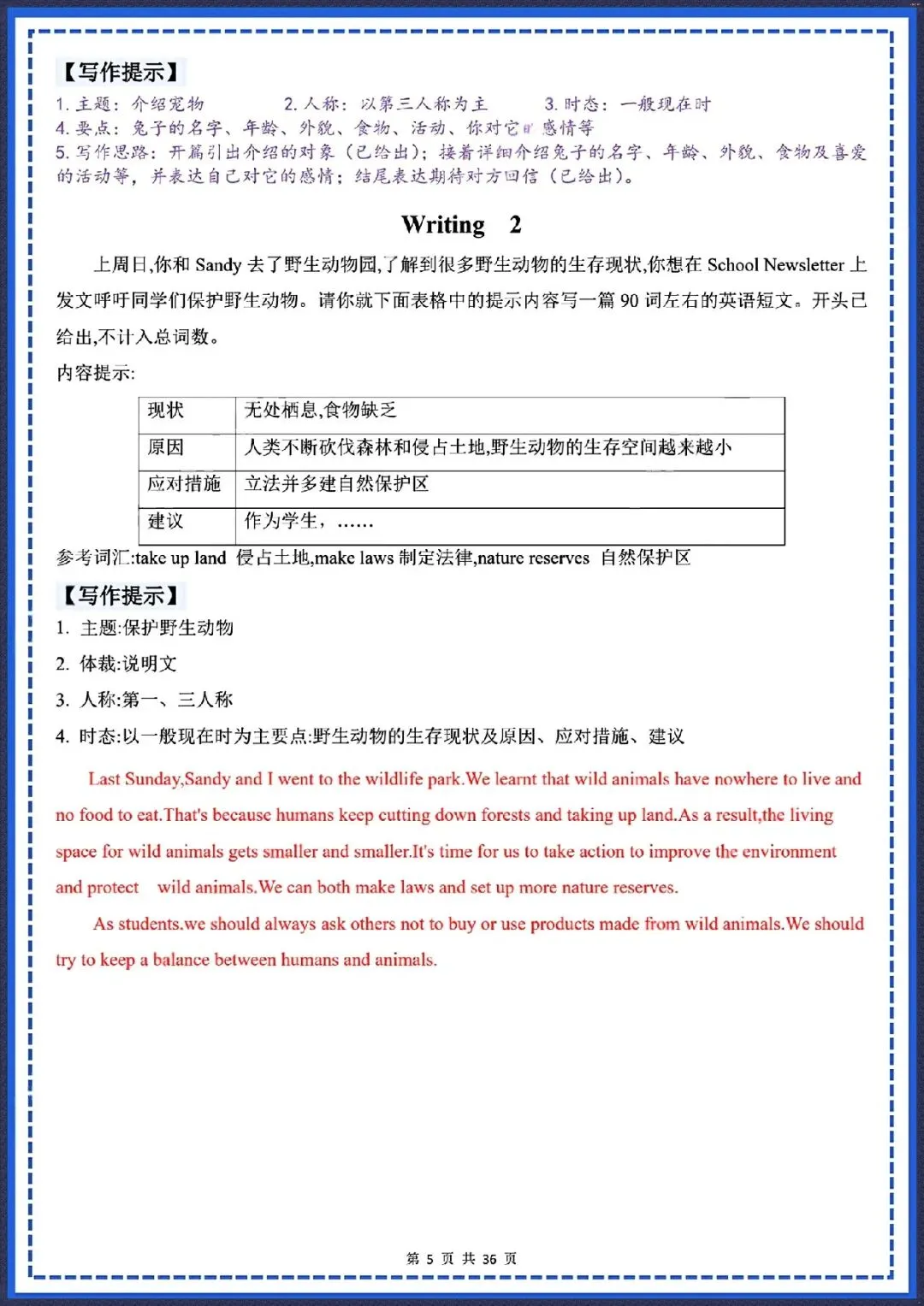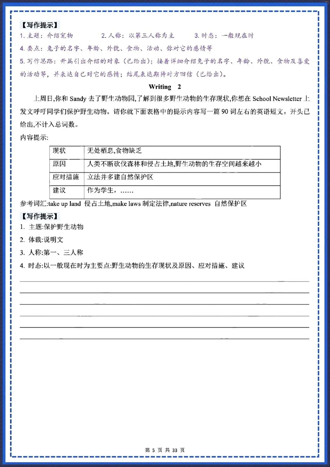 资料按照话题分析+命题预测+写作框架+词句积累+满分范文+迁移训练的科学学习逻辑来组织内容,由模板套用来自主创作逐步过渡,总结了开头结尾万能句和高频好词好句,并且包括了演讲稿、求助信、日记、故事续写等考场上的常见文体,直接针对月考和期末考的重点进行备考。