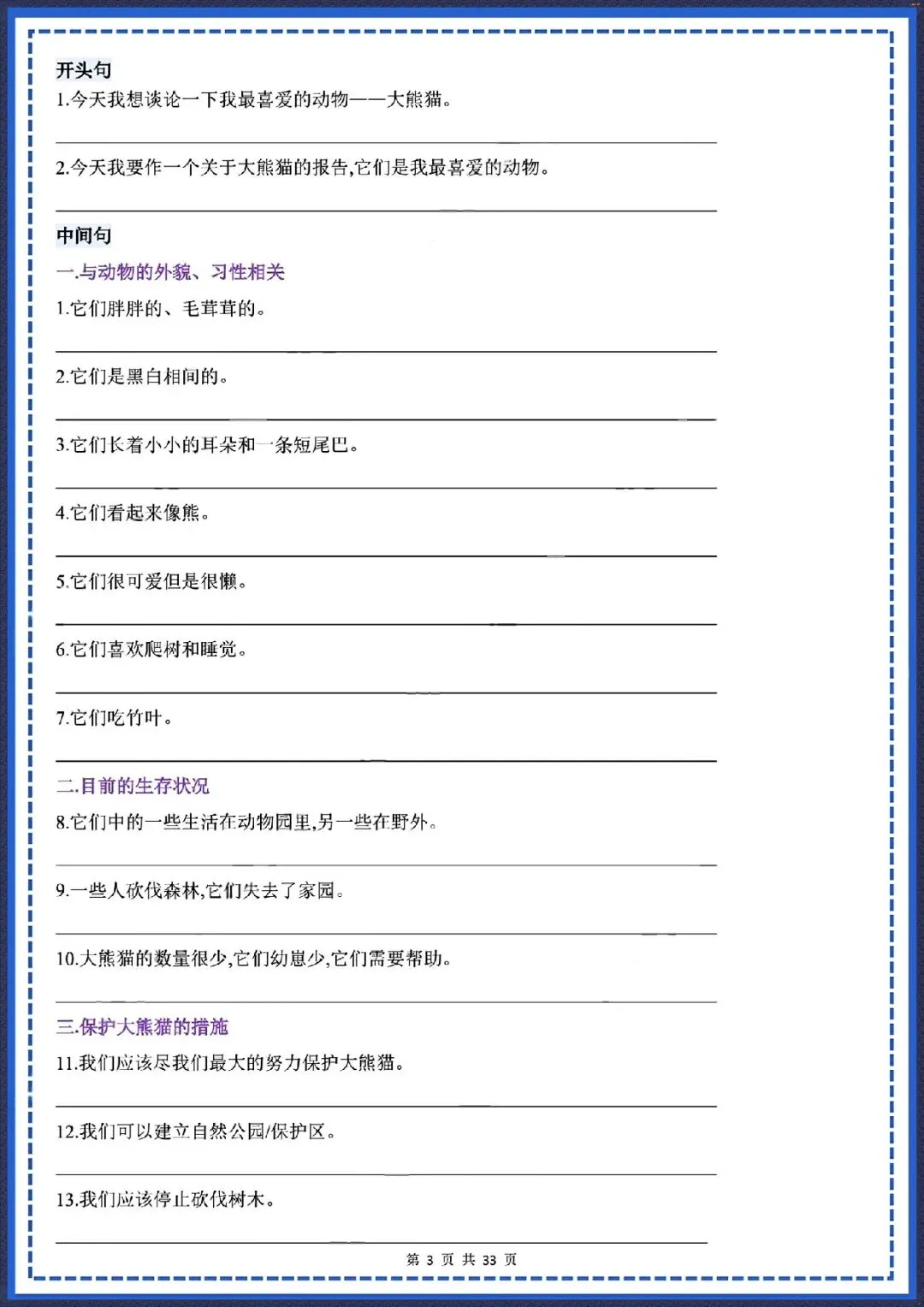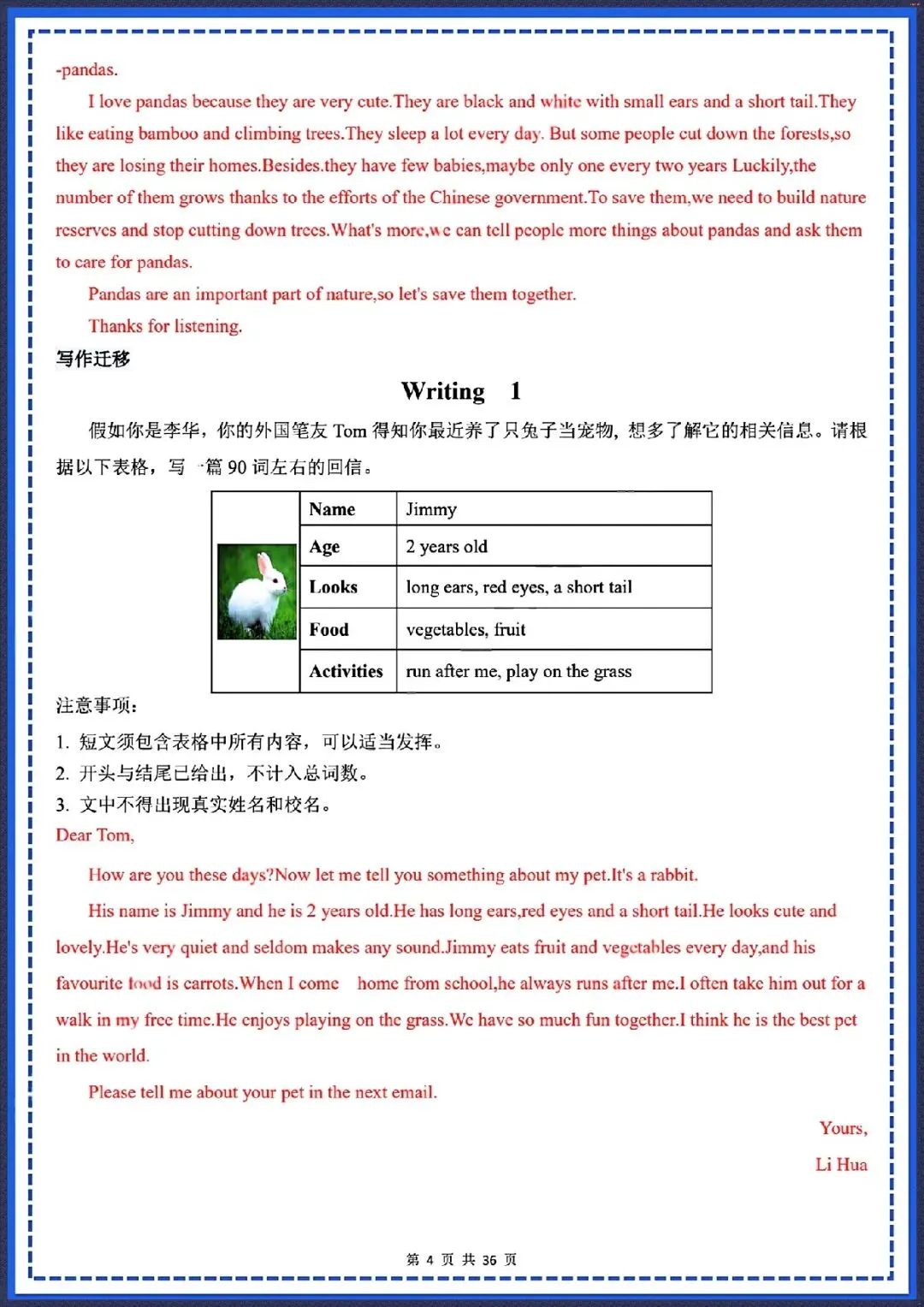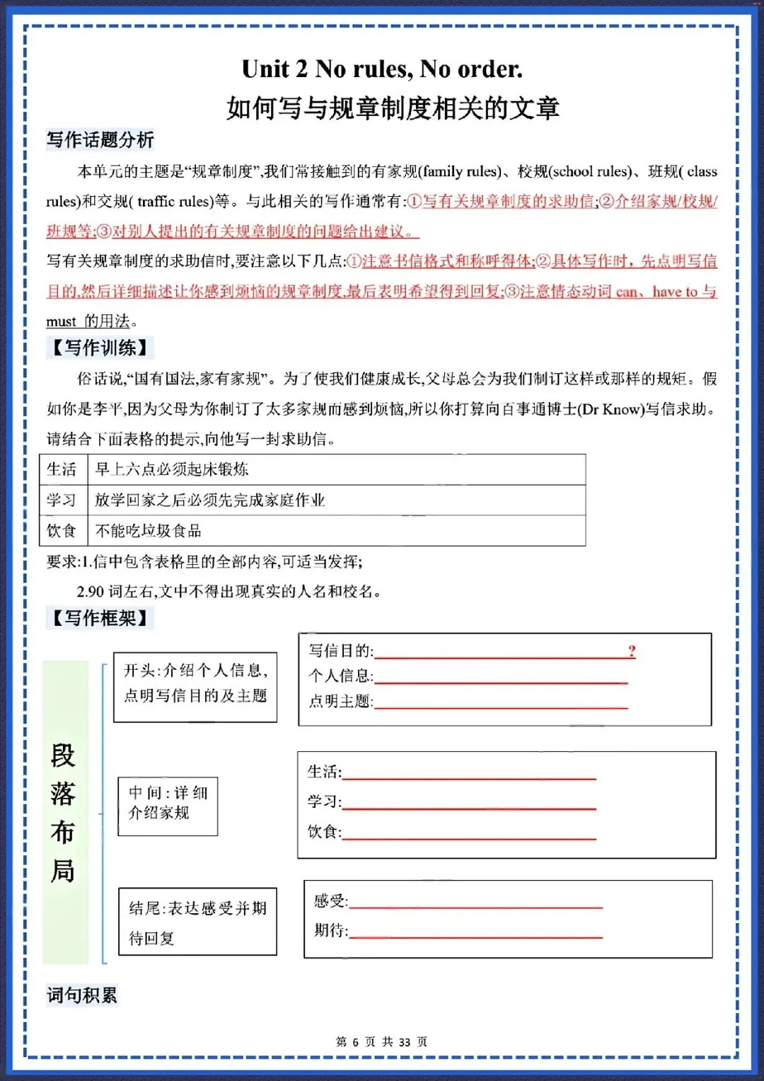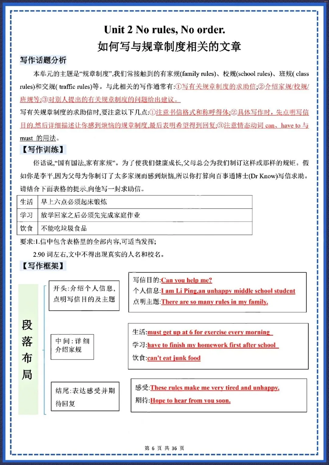 资料按照话题分析+命题预测+写作框架+词句积累+满分范文+迁移训练的科学学习逻辑来组织内容,由模板套用来自主创作逐步过渡,总结了开头结尾万能句和高频好词好句,并且包括了演讲稿、求助信、日记、故事续写等考场上的常见文体,直接针对月考和期末考的重点进行备考。
