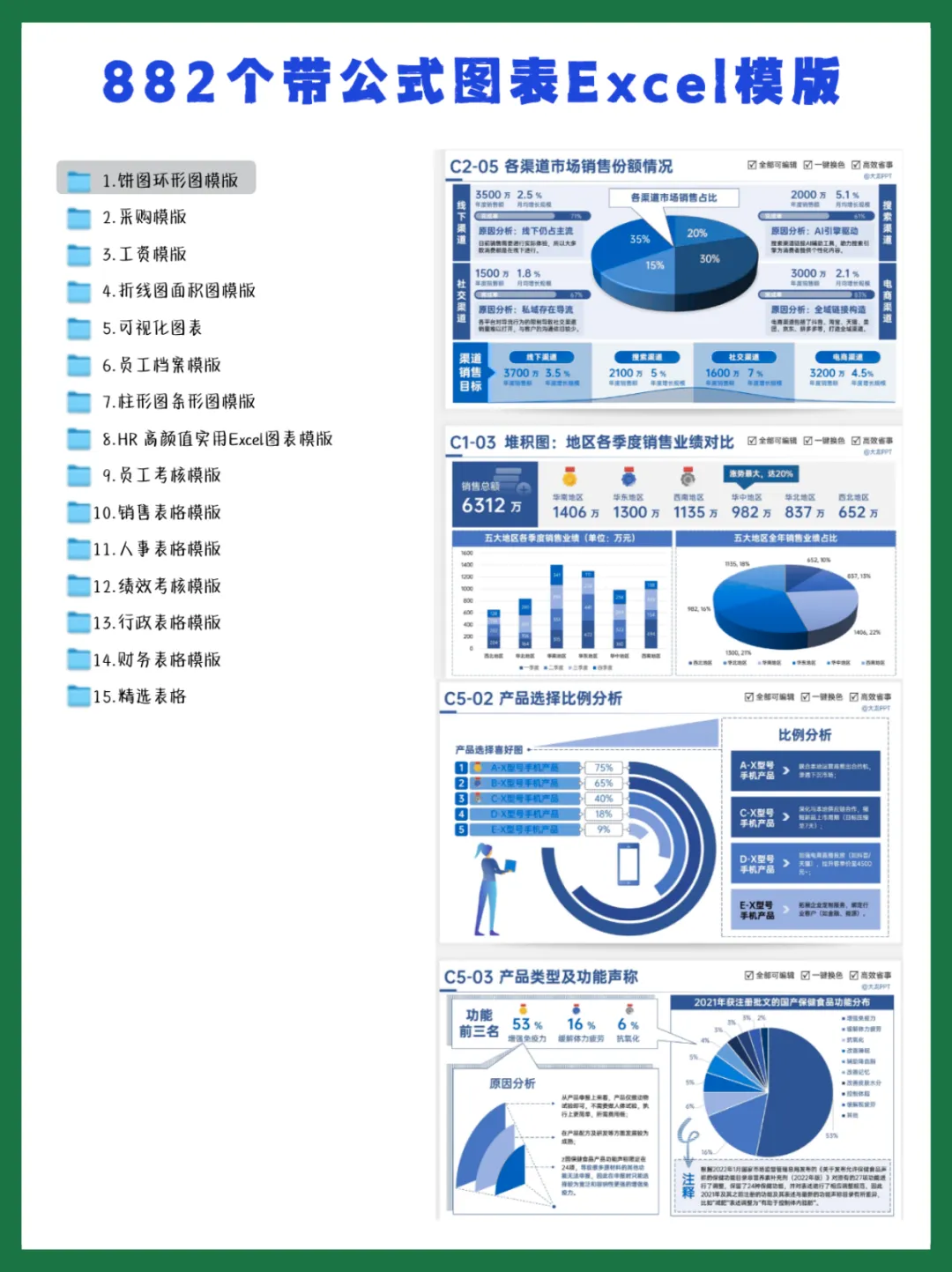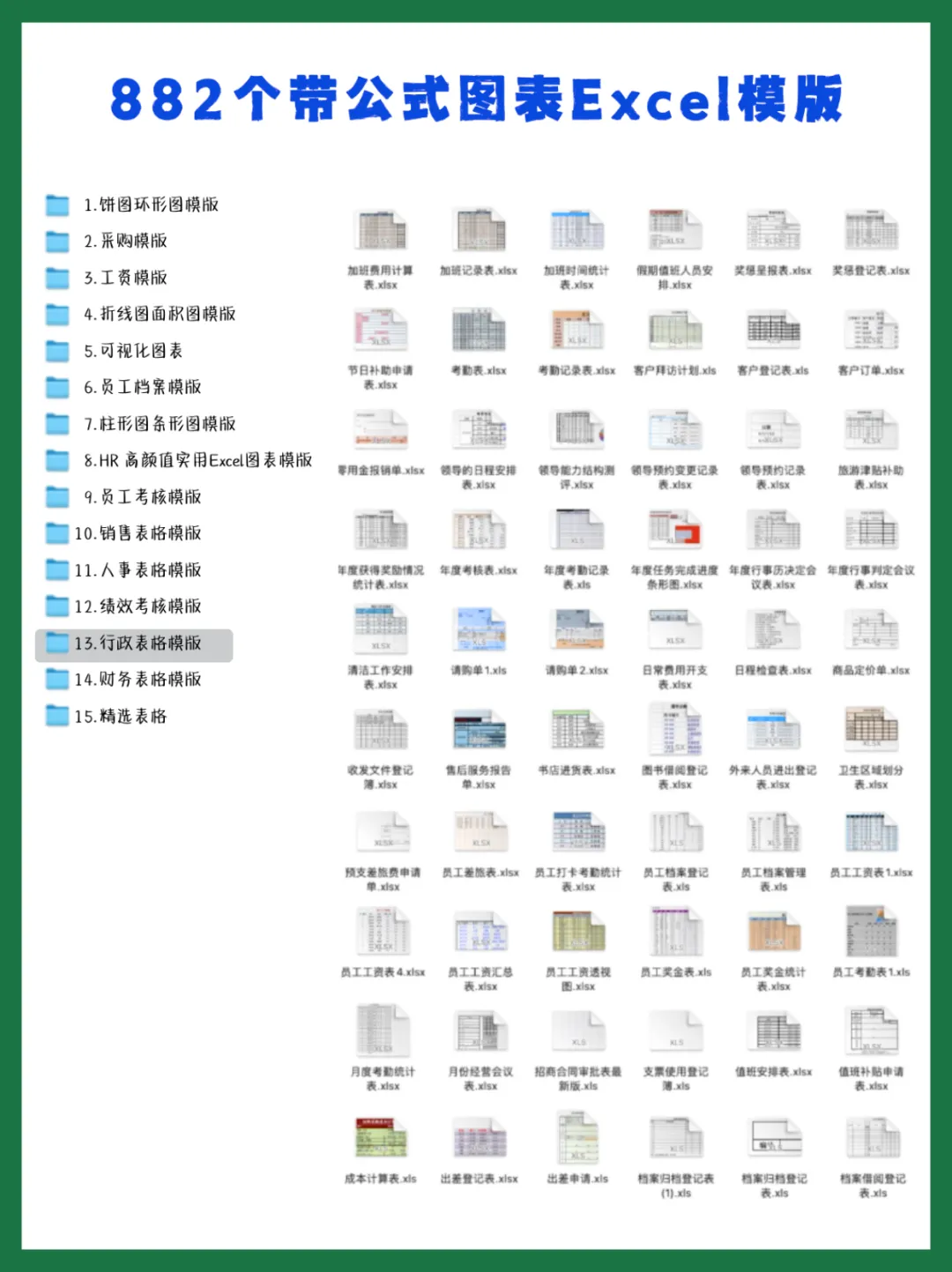 职场人速存!882个Excel模板直接用职场办公离不开Excel工具,但多数人都在低效制表:从零搭框架、手动输公式、反复改图表,既耗时耗力又容易出错。这套全场景Excel模板包,覆盖行政、人事、财务、销售等多岗位都能直接套用,新手老手都能快速上手,告别无效加班。